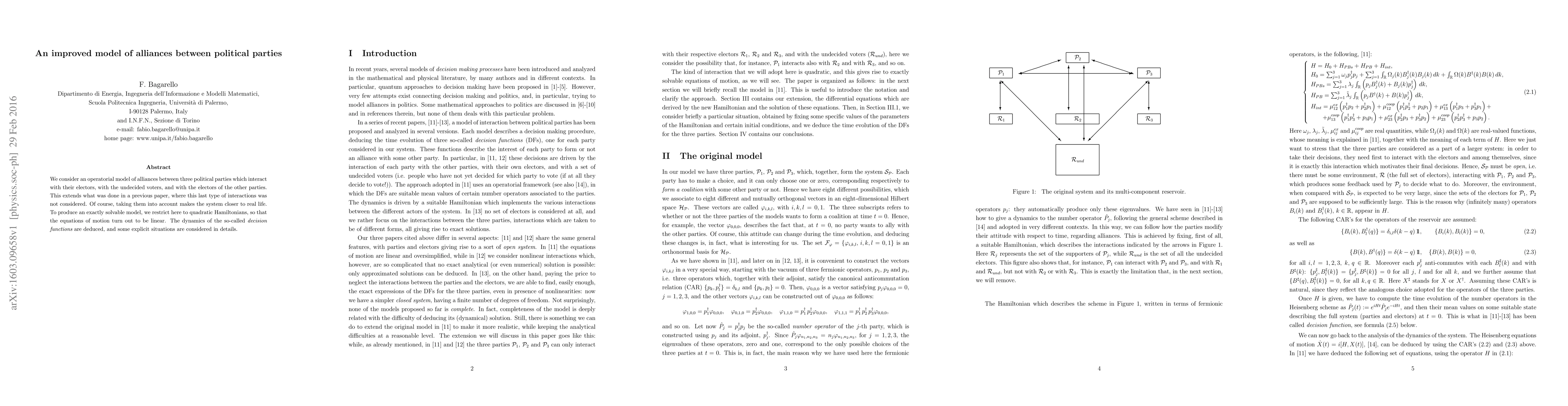 This paper develops an improved model for alliances among three political parties, incorporating interactions with undecided voters and each other's electors, extending a previous model. The authors use quadratic Hamiltonians to create an exactly solvable linear system, deriving the dynamics of decision functions and analyzing specific scenarios.