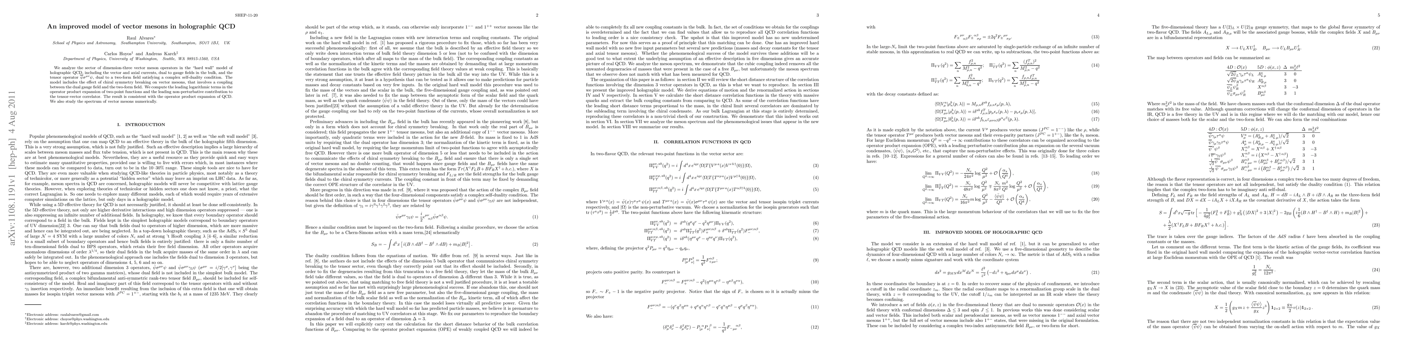 This paper improves the "hard wall" model of holographic QCD to analyze dimension-three vector meson operators, including effects of chiral symmetry breaking and computes leading logarithmic terms in operator product expansions. The study also numerically investigates the spectrum of vector mesons, aligning with QCD predictions.