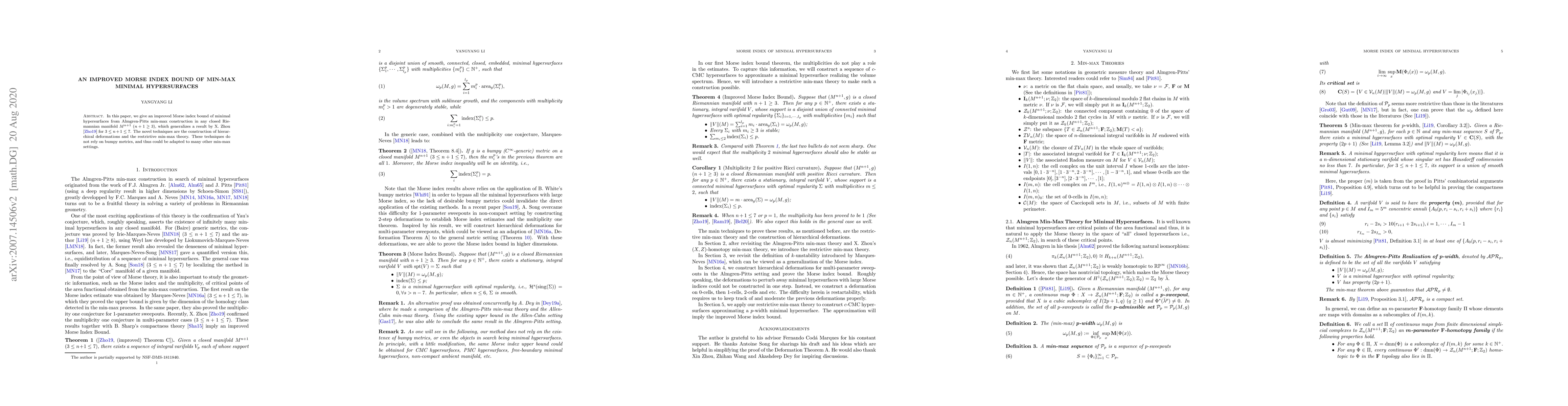 This paper improves the Morse index bound for minimal hypersurfaces derived from Almgren-Pitts min-max construction in any closed Riemannian manifold, extending previous results to higher dimensions. The authors employ hierarchical deformations and restrictive min-max theory, which are adaptable to various min-max settings without requiring bumpy metrics.