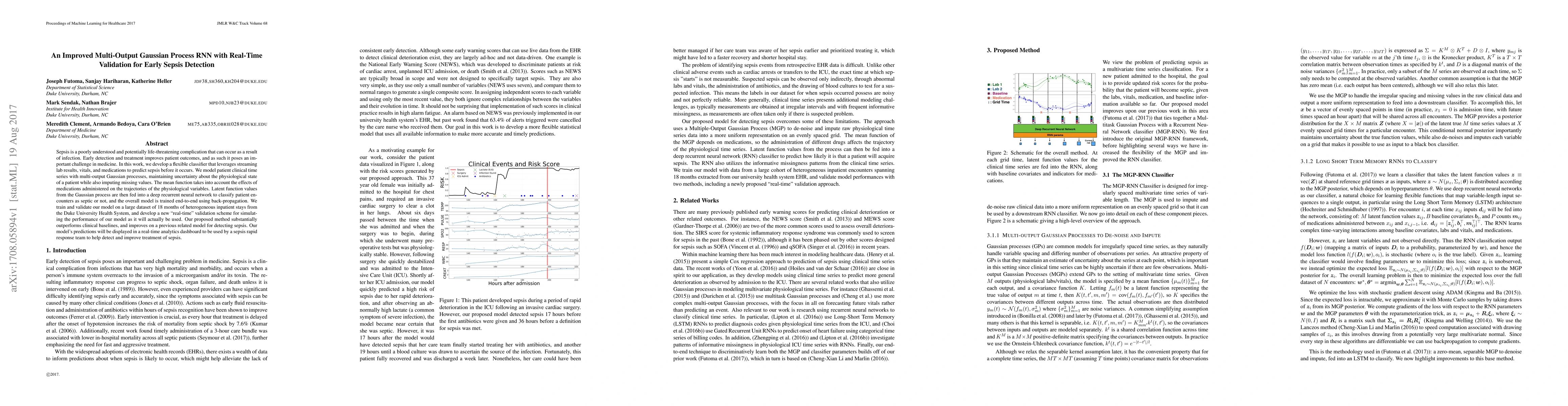 This paper presents an advanced multi-output Gaussian process RNN model for early sepsis detection using real-time validation. The model effectively predicts sepsis by integrating streaming lab results, vitals, and medications, outperforming clinical baselines and improving upon previous methods.