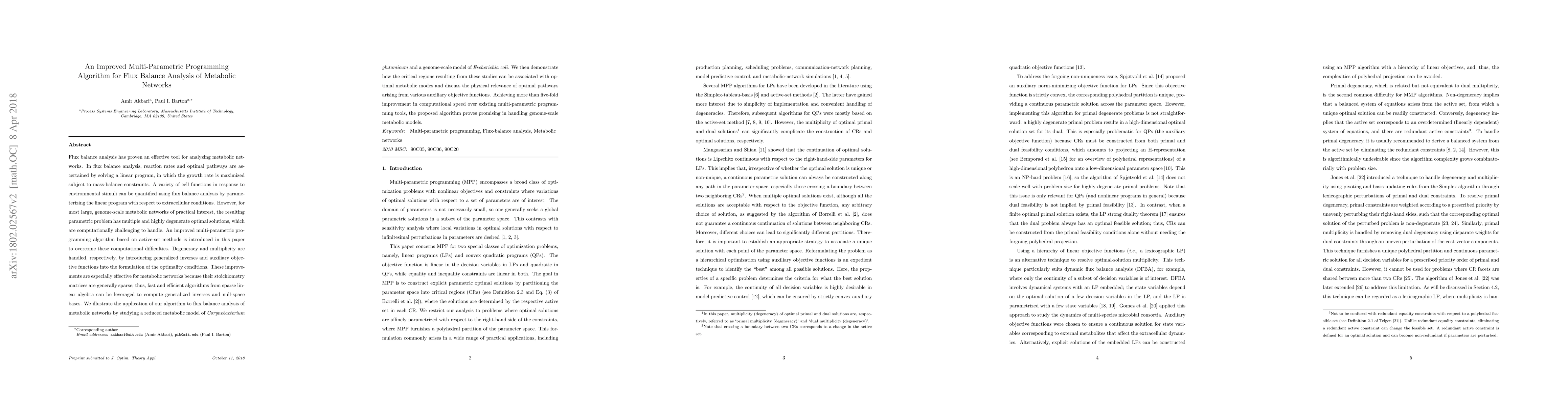 This paper introduces an improved multi-parametric programming algorithm based on active-set methods to handle computational challenges in flux balance analysis of large metabolic networks. The algorithm leverages generalized inverses and auxiliary objective functions to manage degeneracy and multiplicity, achieving over five-fold improvement in computational speed compared to existing tools.