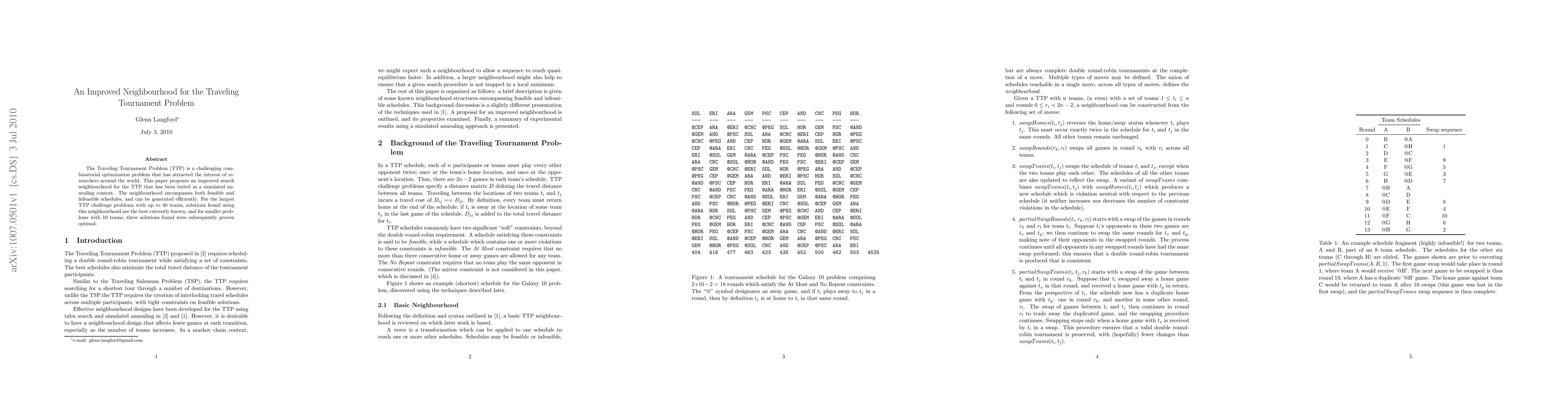 The Traveling Tournament Problem (TTP) is a challenging combinatorial optimization problem that has attracted the interest of researchers around the world. This paper proposes an improved search neighbourhood for the TTP that has been tested in a simulated annealing context. The neighbourhood encompasses both feasible and infeasible schedules, and can be generated efficiently. For the largest TTP challenge problems with up to 40 teams, solutions found using this neighbourhood are the best currently known, and for smaller problems with 10 teams, three solutions found were subsequently proven optimal.