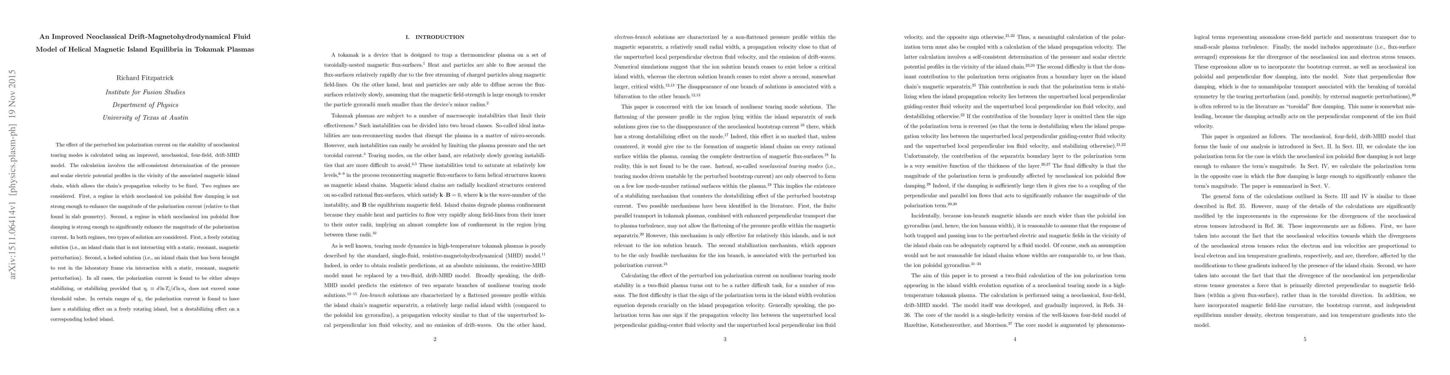 The effect of the perturbed ion polarization current on the stability of neoclassical tearing modes is calculated using an improved, neoclassical, four-field, drift-MHD model. The calculation involves the self-consistent determination of the pressure and scalar electric potential profiles in the vicinity of the associated magnetic island chain, which allows the chain's propagation velocity to be fixed. Two regimes are considered. First, a regime in which neoclassical ion poloidal flow damping is not strong enough to enhance the magnitude of the polarization current (relative to that found in slab geometry). Second, a regime in which neoclassical ion poloidal flow damping is strong enough to significantly enhance the magnitude of the polarization current. In both regimes, two types of solution are considered. First, a freely rotating solution (i.e., an island chain that is not interacting with a static, resonant, magnetic perturbation). Second, a locked solution (i.e., an island chain that has been brought to rest in the laboratory frame via interaction with a static, resonant, magnetic perturbation). In all cases, the polarization current is found to be either always stabilizing, or stabilizing provided that eta_i = d ln T_i/d ln n_e does not exceed some threshold value. In certain ranges of eta_i, the polarization current is found to have have a stabilizing effect on a freely rotating island, but a destabilizing effect on a corresponding locked island.