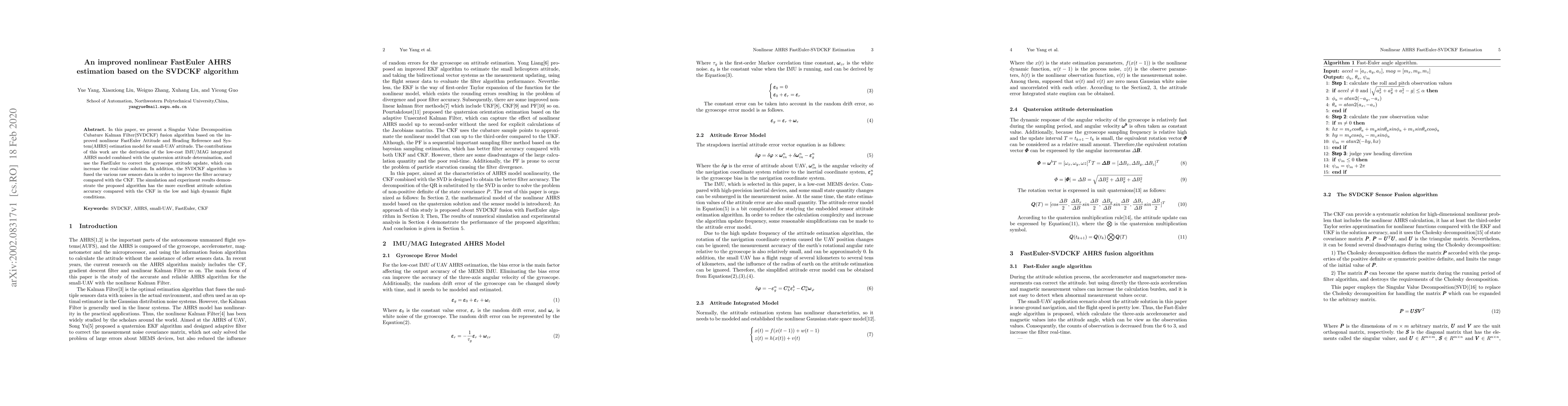 In this paper, we present a Singular Value Decomposition Cubature Kalman Filter(SVDCKF) fusion algorithm based on the improved nonlinear FastEuler Attitude and Heading Reference and System(AHRS) estimation model for small-UAV attitude. The contributions of this work are the derivation of the low-cost IMU/MAG integrated AHRS model combined with the quaternion attitude determination, and use the FastEuler to correct the gyroscope attitude update, which can increase the real-time solution. In addition, the SVDCKF algorithm is fused the various raw sensors data in order to improve the filter accuracy compared with the CKF. The simulation and experiment results demonstrate the proposed algorithm has the more excellent attitude solution accuracy compared with the CKF in the low and high dynamic flight conditions.
