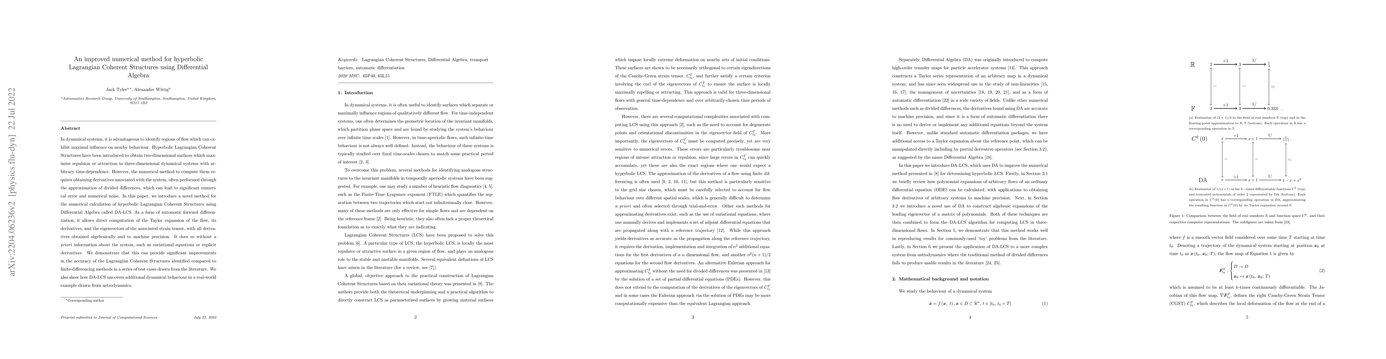 This paper introduces a novel numerical method, DA-LCS, using Differential Algebra for computing hyperbolic Lagrangian Coherent Structures, achieving higher accuracy by avoiding numerical errors from finite differencing and providing precise algebraic derivatives. The method demonstrates improved accuracy and reveals additional dynamics in test cases and an astrodynamics example.