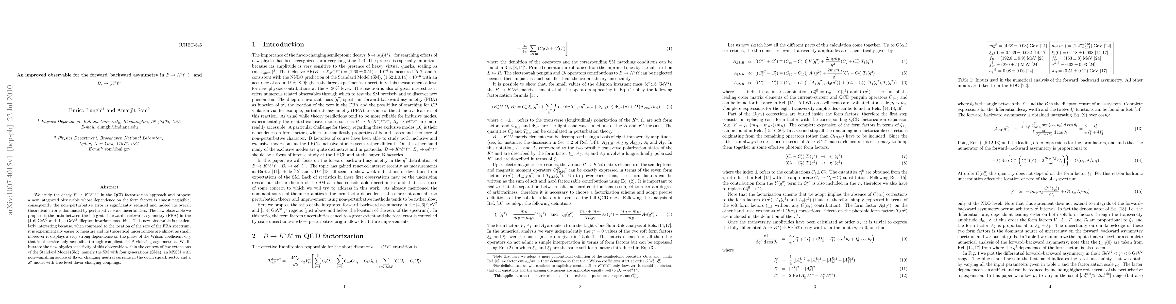 We study the decay B -> K* l+ l- in the QCD factorization approach and propose a new integrated observable whose dependence on the form factors is almost negligible, consequently the non--perturbative error is significantly reduced and indeed its overall theoretical error is dominated by perturbative scale uncertainties. The new observable we propose is the ratio between the integrated forward--backward asymmetry in the [4,6] GeV^2 and [1,4] GeV^2 dilepton invariant mass bins. This new observable is particularly interesting because, when compared to the location of the zero of the FBA spectrum, it is experimentally easier to measure and its theoretical uncertainties are almost as small; moreover it displays a very strong dependence on the phase of the Wilson coefficient C_10 that is otherwise only accessible through complicated CP violating asymmetries. We illustrate the new physics sensitivity of this observable within the context of few extensions of the Standard Model, namely the SM with four generations, an MSSM with non--vanishing source of flavor changing neutral currents in the down squark sector and a Z' model with tree level flavor changing couplings.