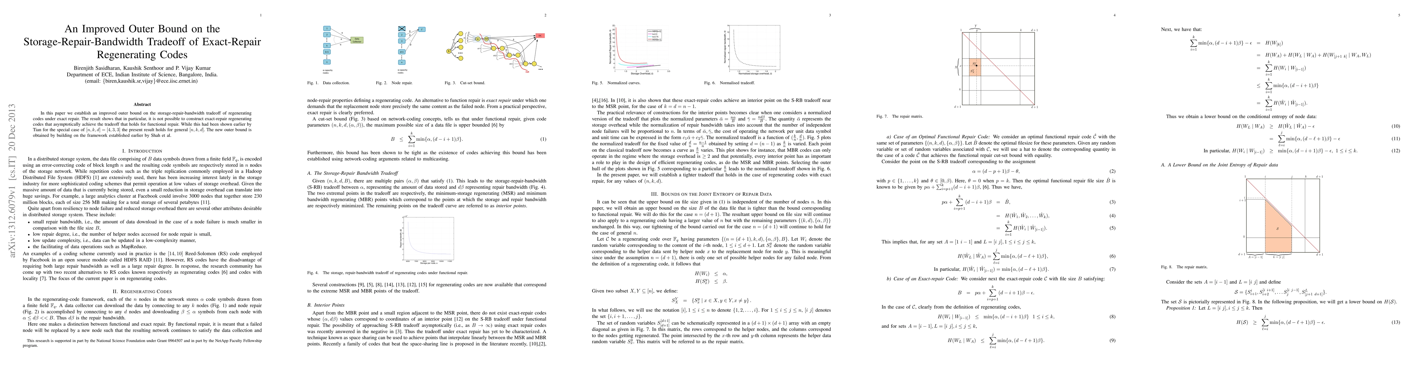 This paper establishes an improved outer bound on the storage-repair-bandwidth tradeoff for exact-repair regenerating codes, demonstrating that exact-repair codes cannot asymptotically achieve the same tradeoff as functional repair codes, extending previous results to general parameters. The new bound builds on the framework developed by Shah et al.