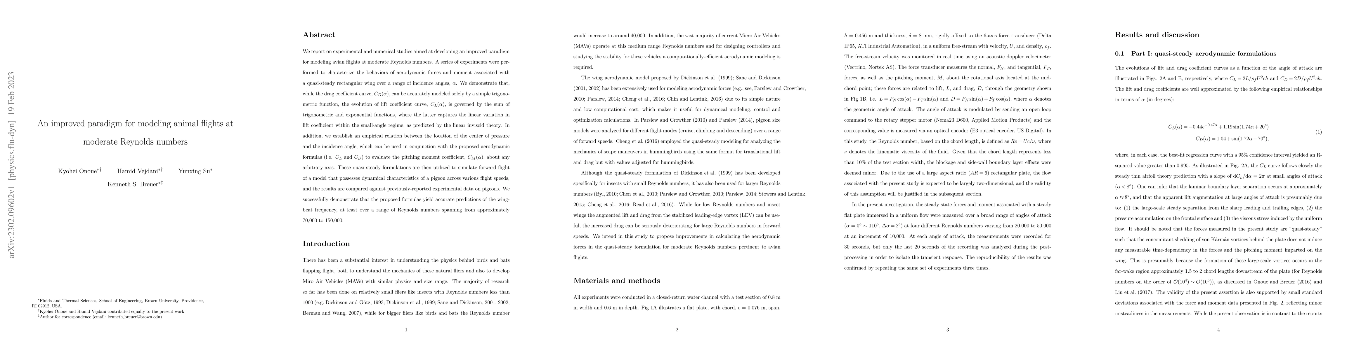 This paper develops improved models for avian flight at moderate Reynolds numbers through experimental and numerical studies, showing that lift and drag coefficients can be modeled with trigonometric and exponential functions, respectively. The proposed aerodynamic formulas accurately predict wing-beat frequency for pigeon-like flight dynamics.