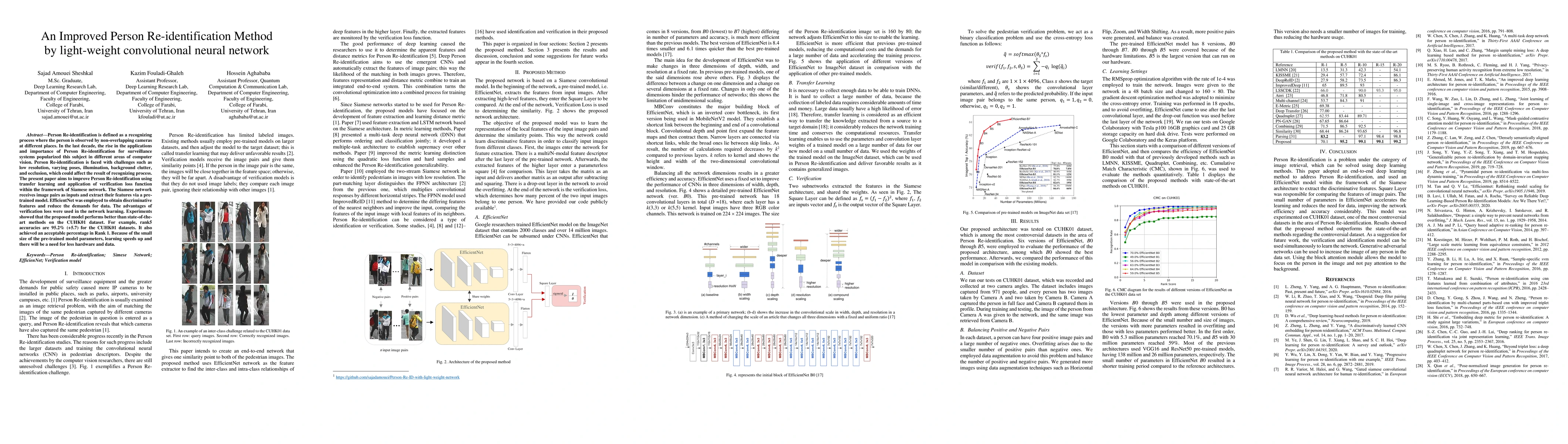 This paper proposes an enhanced Person Re-identification method using a lightweight convolutional neural network, specifically EfficientNet, within a Siamese network framework. The method employs transfer learning and a verification loss function to achieve better accuracy and efficiency, outperforming state-of-the-art methods on the CUHK01 dataset with improved rank-5 accuracy.