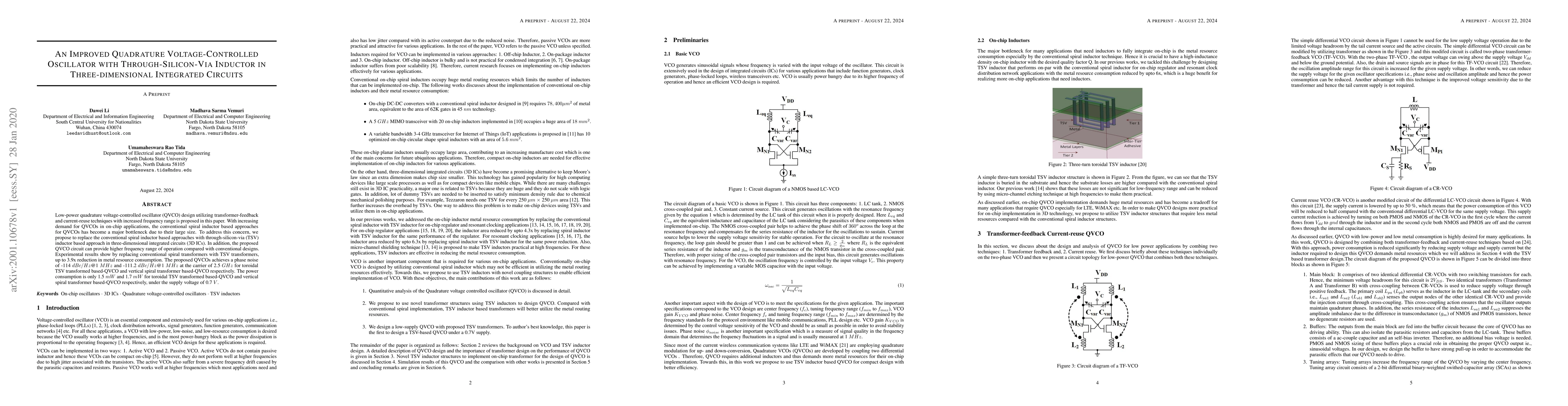 This paper presents an improved low-power quadrature voltage-controlled oscillator (QVCO) using transformer-feedback and current-reuse techniques in 3D ICs, replacing spiral inductors with through-silicon-via (TSV) inductors to enhance frequency range and reduce metal resource consumption. The proposed QVCOs achieve phase noise of -114 dBc/Hz@1 MHz and power consumption of 1.5 mW at 0.7 V.