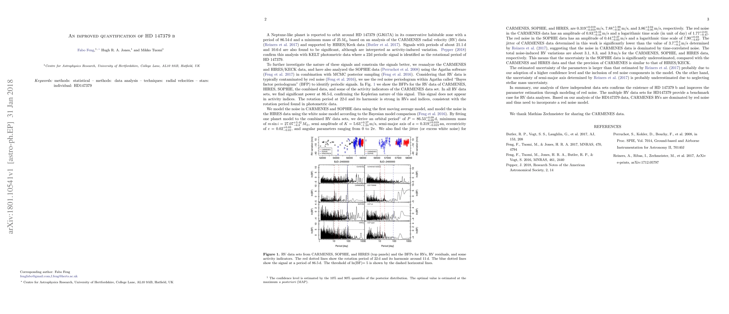 We reanalyze the CARMENES and HIRES/KECK radial velocity data for HD 147379, and also analyze the SOPHIE data using the Agatha software in combination with MCMC posterior sampling. The analysis confirms the existence of HD 147379 b and improves the parameter estimation through modeling of red noise. The multiple radial velocity data sets for HD147379 provide a benchmark case for RV data analyses. Based on our analysis of the HD 147379 data, CARMENES radial velocity data is dominated by red noise and thus need to incorporate a red noise model.