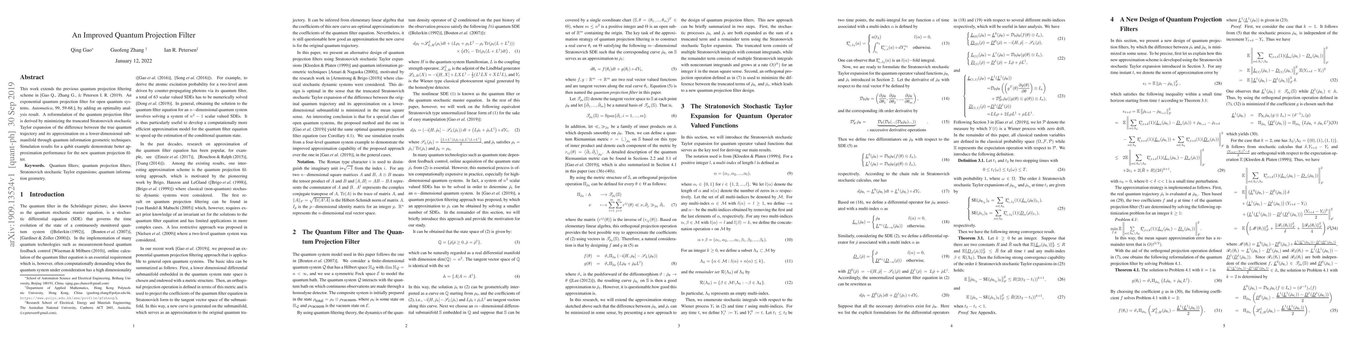 A new quantum projection filter with improved approximation performance has been developed through optimization techniques, leading to better results in simulations for a qubit example.