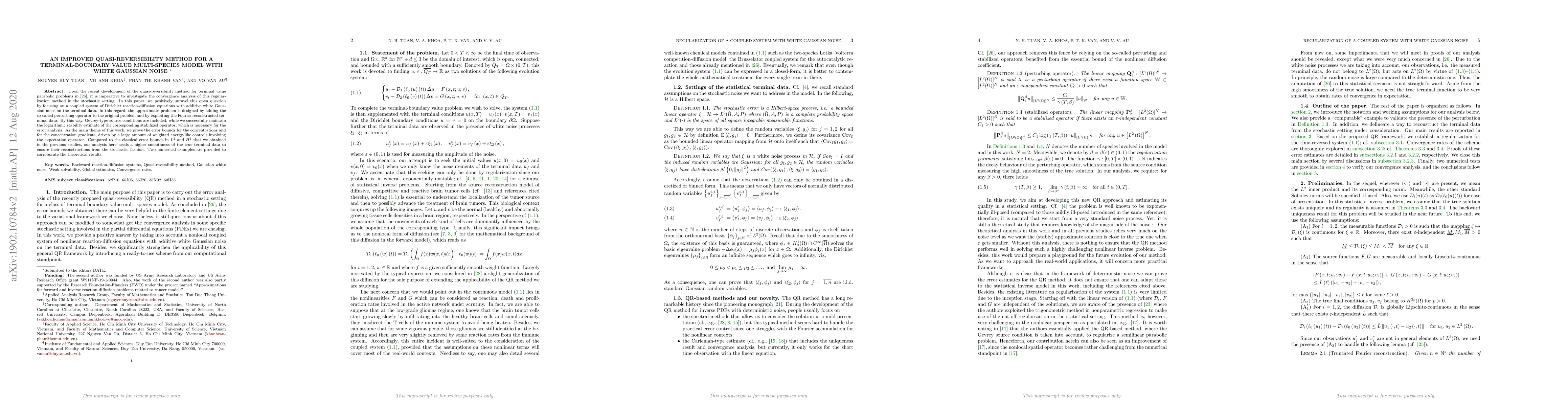 This paper investigates the convergence of the quasi-reversibility method for a multi-species model with stochastic terminal boundary conditions, proving error bounds for the concentrations and gradients. The method incorporates a perturbing operator and Fourier reconstruction for stability, requiring higher smoothness of the true terminal data.