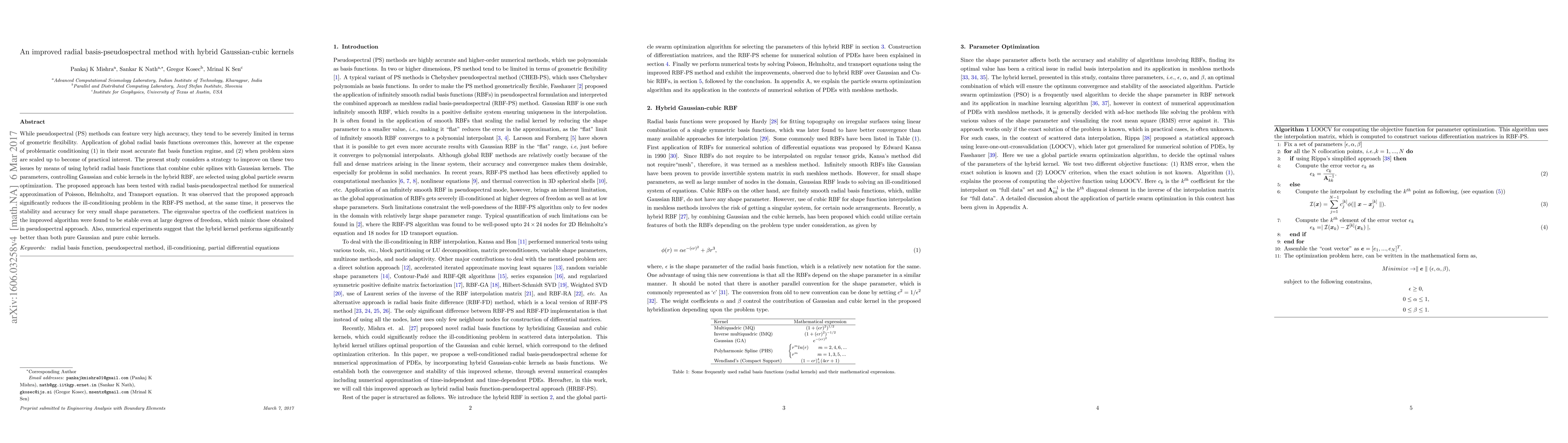 This paper proposes an improved radial basis-pseudospectral method using hybrid Gaussian-cubic kernels to address ill-conditioning issues and enhance geometric flexibility. The hybrid kernels, optimized via global particle swarm optimization, significantly reduce ill-conditioning and maintain stability and accuracy, outperforming both pure Gaussian and cubic kernels in numerical experiments.