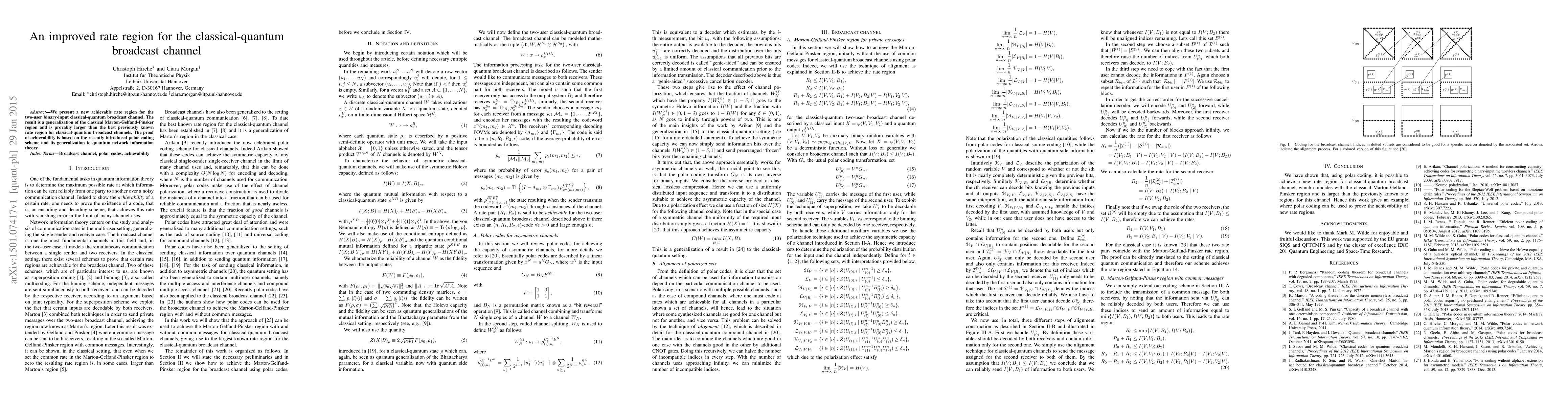 This paper introduces a new achievable rate region for the two-user classical-quantum broadcast channel, surpassing previous results. The improvement is based on a generalized polar coding scheme adapted for quantum network information theory.