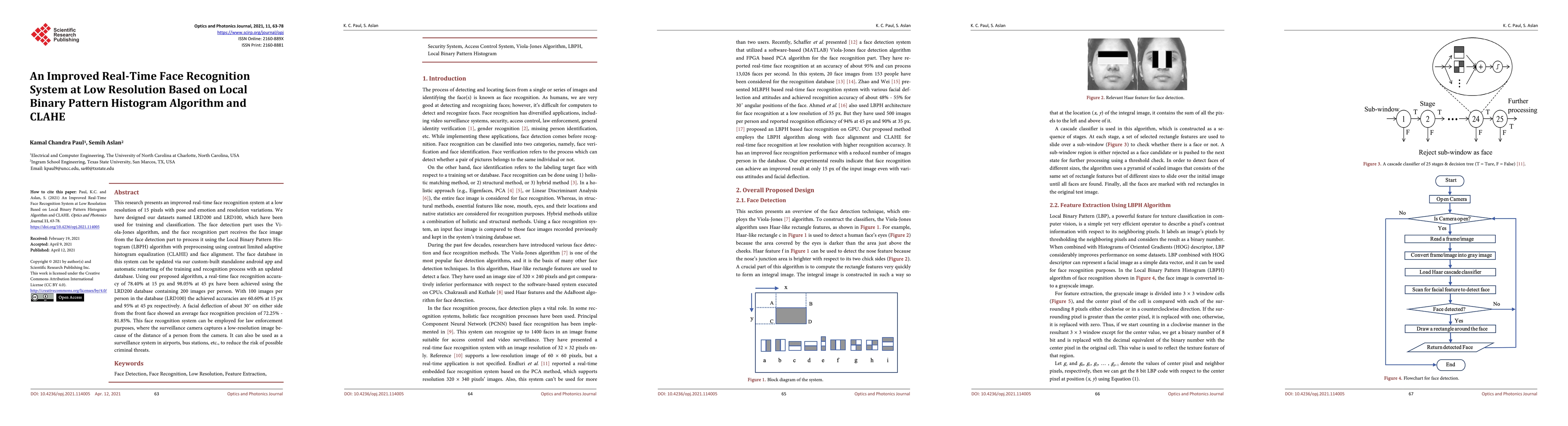 This paper proposes an enhanced real-time face recognition system at low resolution using the LBPH algorithm with CLAHE preprocessing, achieving 78.40% accuracy at 15 pixels and 98.05% at 45 pixels. The system can handle pose and emotion variations and is suitable for law enforcement and surveillance.