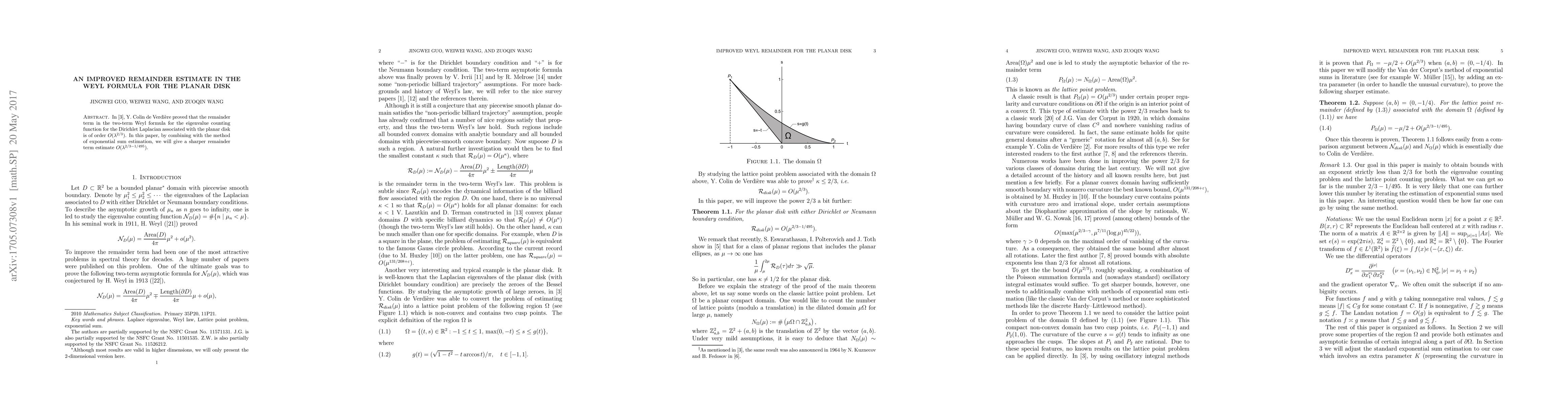 This paper improves the remainder estimate in the Weyl formula for eigenvalues of the Dirichlet Laplacian in a planar disk, refining the previous result of $O(\lambda^{2/3})$ to $O(\lambda^{2/3-1/495})$ using advanced exponential sum estimation techniques.