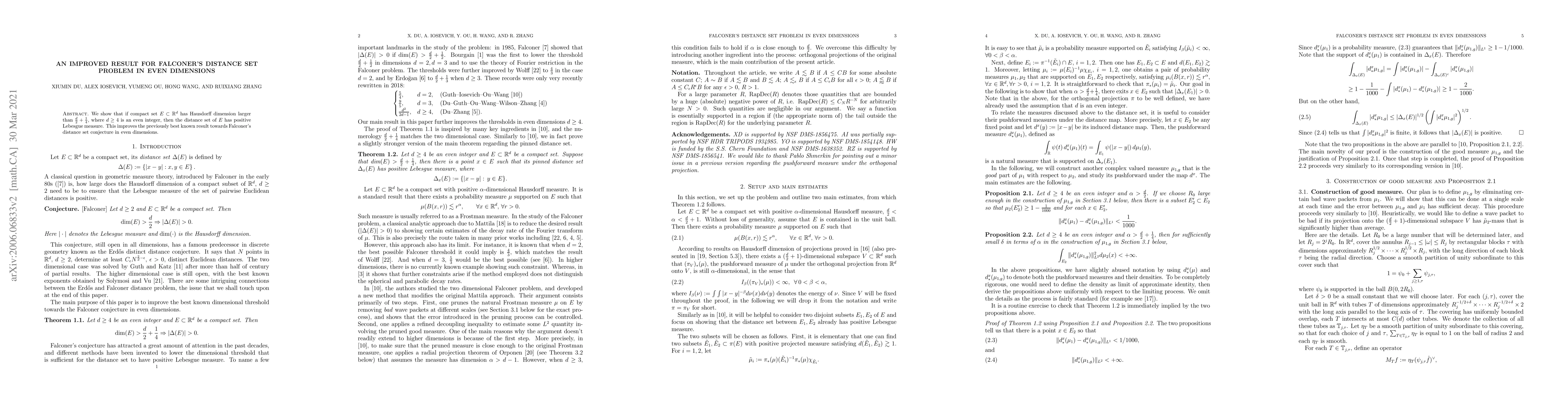 We show that if compact set $E\subset \mathbb{R}^d$ has Hausdorff dimension larger than $\frac{d}{2}+\frac{1}{4}$, where $d\geq 4$ is an even integer, then the distance set of $E$ has positive Lebesgue measure. This improves the previously best known result towards Falconer's distance set conjecture in even dimensions.