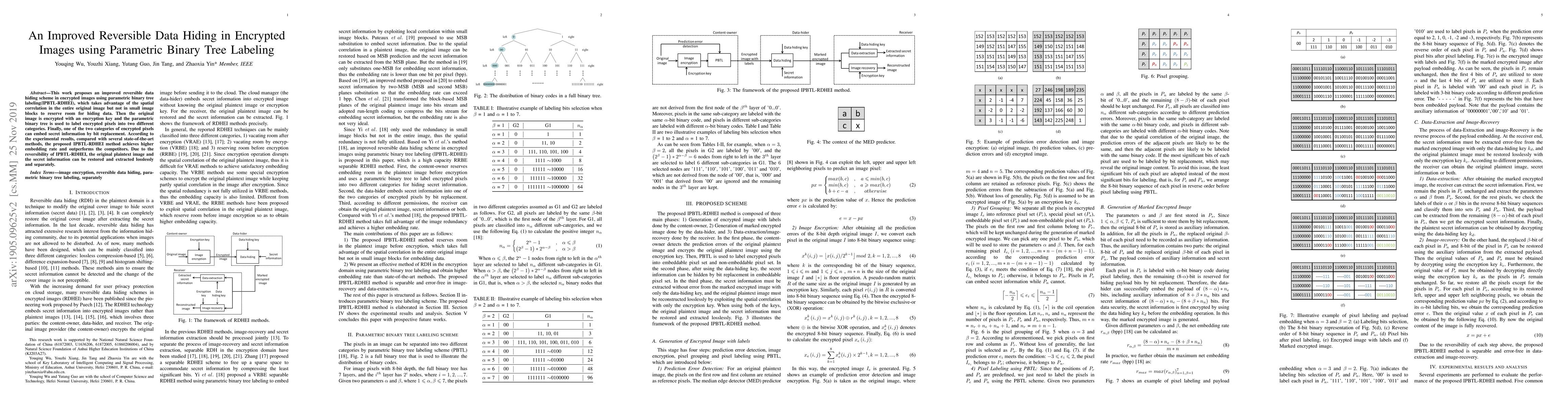 This paper introduces an improved reversible data hiding method (IPBTL-RDHEI) for encrypted images, leveraging parametric binary tree labeling to exploit spatial correlations for higher embedding rates. The method encrypts the image and uses the binary tree to categorize pixels, allowing for lossless embedding and extraction of secret data.