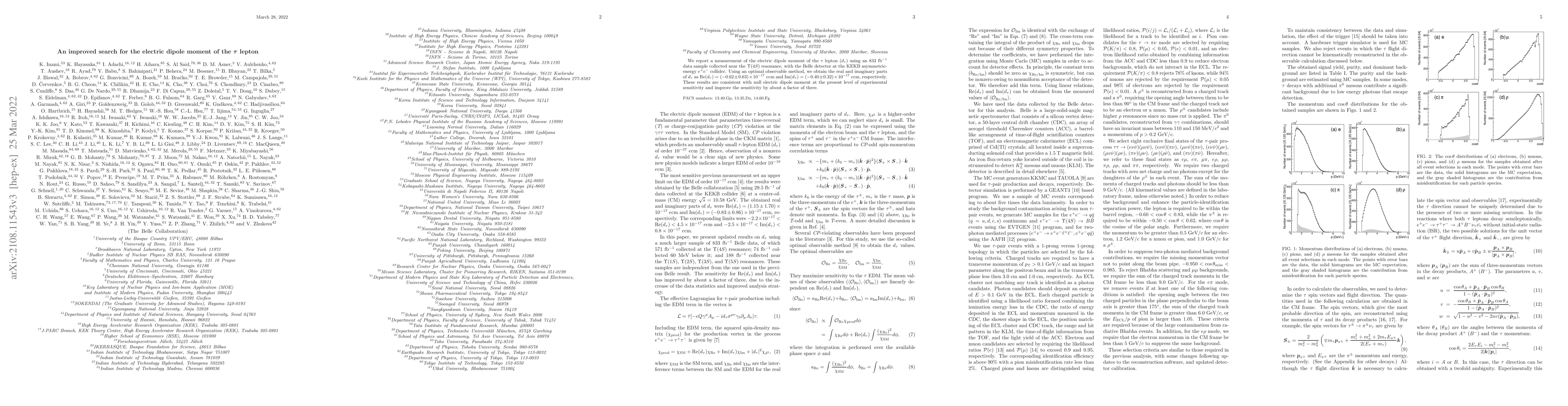 This study reports a refined search for the electric dipole moment of the $\tau$ lepton using data from the Belle detector at KEKB. The results indicate ${\rm Re}(d_\tau) = ( -0.62 \pm 0.63 ) \times 10^{-17} ~e{\rm cm}$ and ${\rm Im}(d_\tau) = ( -0.40 \pm 0.32 ) \times 10^{-17} ~e{\rm cm}$, consistent with no dipole moment, and improve sensitivity by a factor of three.