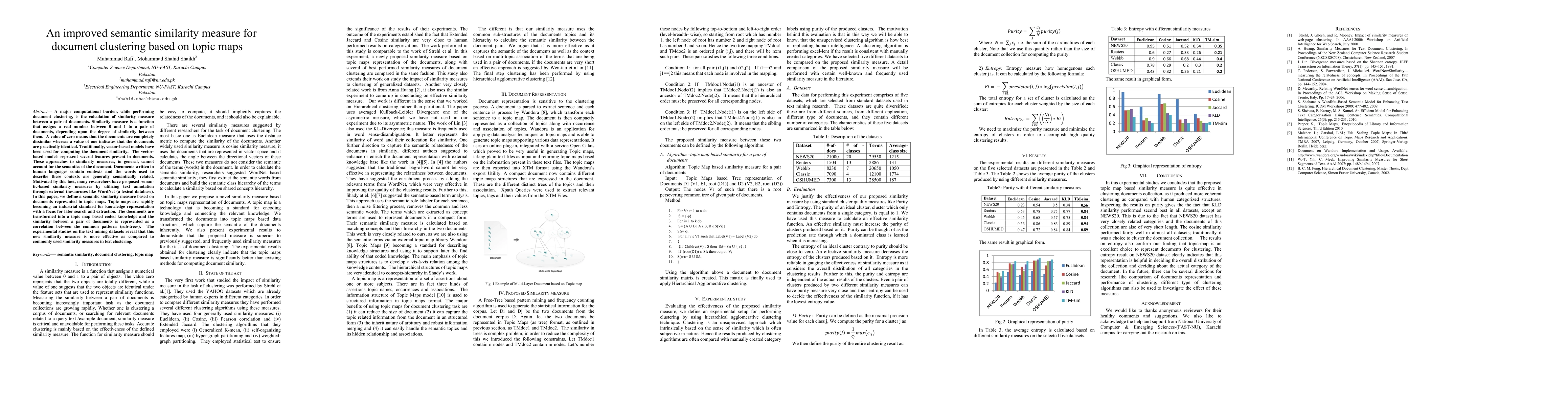 This paper proposes an improved semantic similarity measure for document clustering based on topic maps, which better captures the semantic relationships in documents compared to traditional vector-based models. The new measure correlates common patterns in topic map representations, demonstrating superior performance in text clustering experiments.
