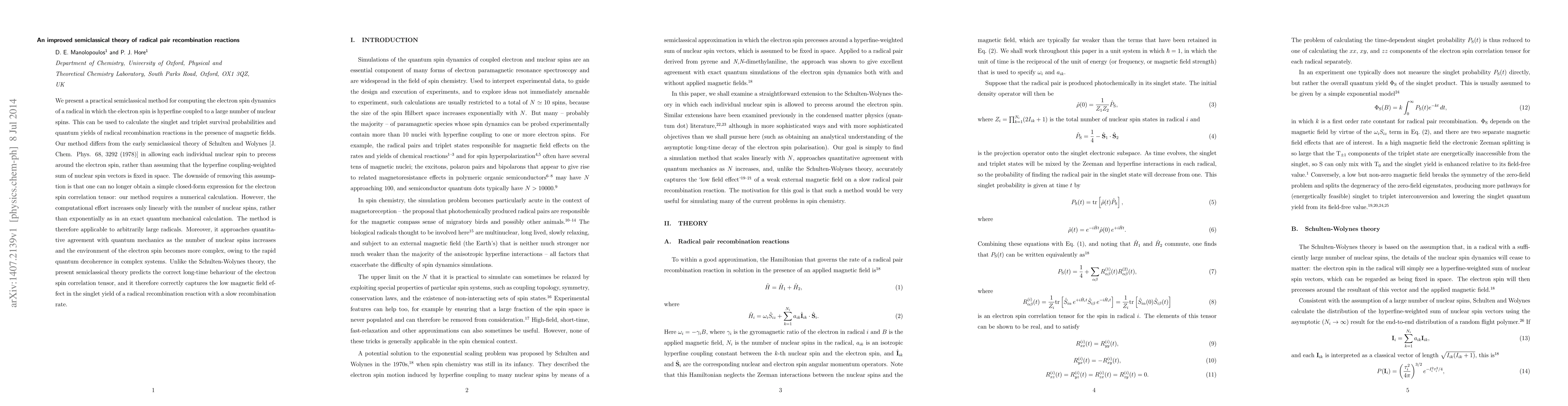 This paper introduces a refined semiclassical method for calculating electron spin dynamics in large radicals, allowing individual nuclear spins to precess around the electron spin. It provides accurate singlet and triplet survival probabilities and quantum yields for radical recombination reactions, improving upon the Schulten-Wolynes theory by predicting the correct long-time behavior and low magnetic field effect.