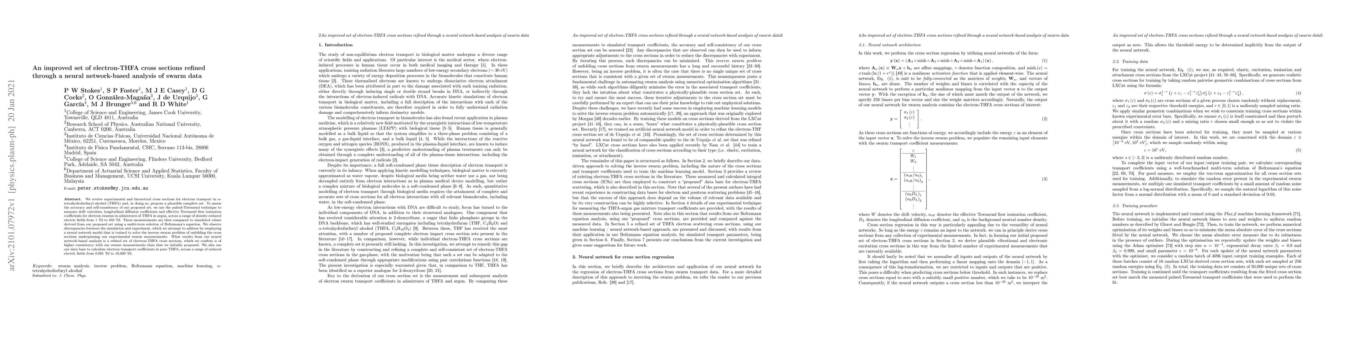 We review experimental and theoretical cross sections for electron transport in $\alpha$-tetrahydrofurfuryl alcohol (THFA) and, in doing so, propose a plausible complete set. To assess the accuracy and self-consistency of our proposed set, we use the pulsed-Townsend technique to measure drift velocities, longitudinal diffusion coefficients and effective Townsend first ionisation coefficients for electron swarms in admixtures of THFA in argon, across a range of density-reduced electric fields from 1 Td to 450 Td. These measurements are then compared to simulated values derived from our proposed set using a multi-term solution of Boltzmann's equation. We observe discrepancies between the simulation and experiment, which we attempt to address by employing a neural network model that is trained to solve the inverse swarm problem of unfolding the cross sections underpinning our experimental swarm measurements. What results from our neural network-based analysis is a refined set of electron-THFA cross sections, which we confirm is of higher consistency with our swarm measurements than that we initially proposed. We also use our data base to calculate electron transport coefficients in pure THFA, across a range of reduced electric fields from 0.001 Td to 10,000 Td.