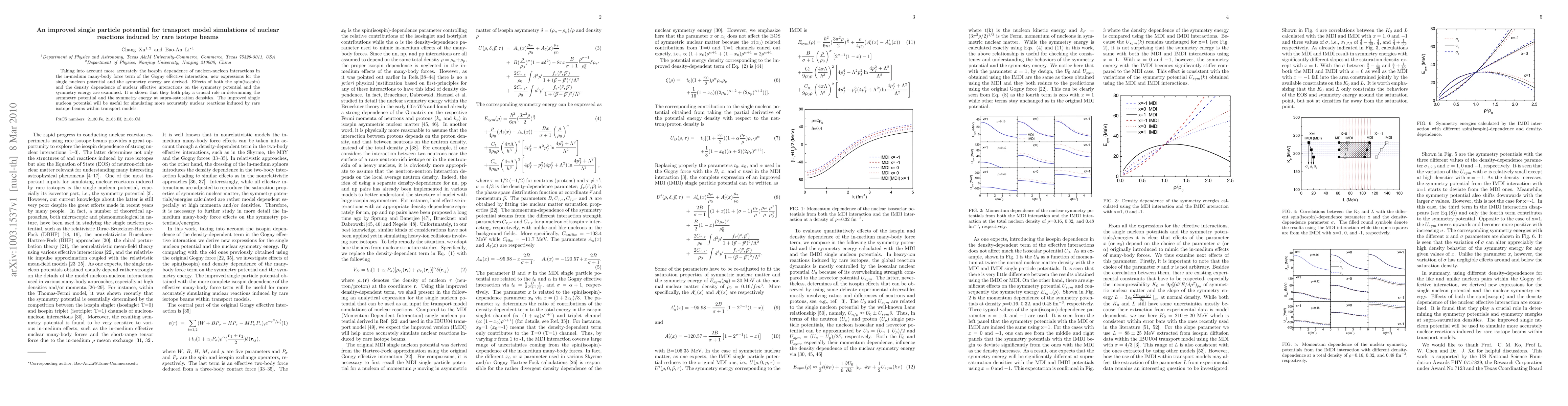 This paper presents a refined single particle potential for transport model simulations of nuclear reactions, incorporating improved isospin dependence in the nucleon-nucleon interaction. The new expressions for the single nucleon potential and symmetry energy are shown to significantly influence the symmetry potential and energy at supra-saturation densities, enhancing the accuracy of simulations involving rare isotope beams.