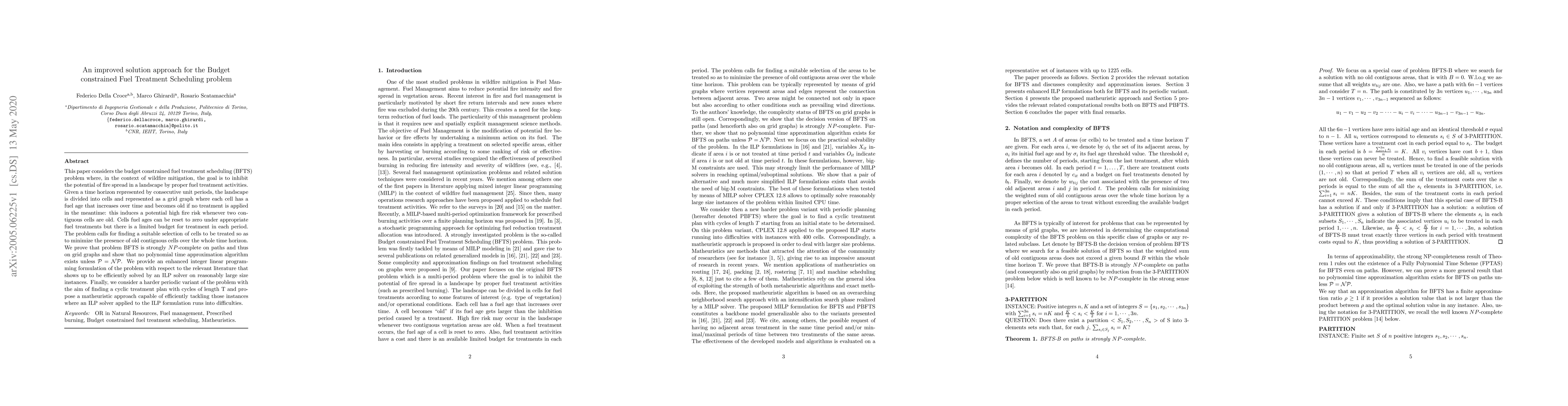 This paper addresses the budget constrained fuel treatment scheduling problem (BFTS) for wildfire mitigation, proving its strong NP-completeness. It introduces an enhanced integer linear programming formulation and a matheuristic approach to efficiently solve both the general and periodic variants of the problem.