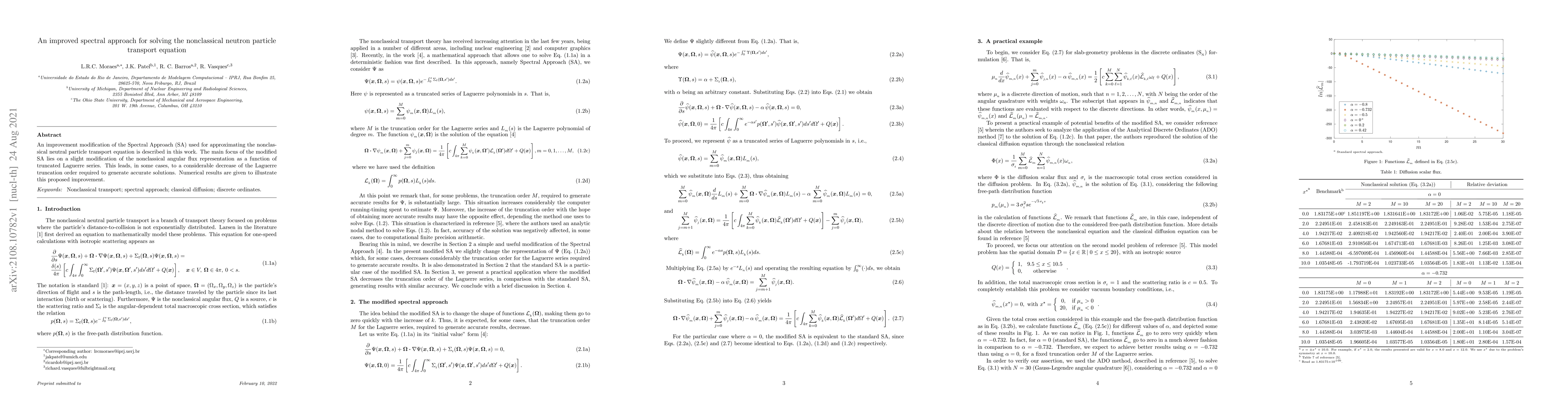An improvement modification of the Spectral Approach (SA) used for approximating the nonclassical neutral particle transport equation is described in this work. The main focus of the modified SA lies on a slight modification of the nonclassical angular flux representation as a function of truncated Laguerre series. This leads, in some cases, to a considerable decrease of the Laguerre truncation order required to generate accurate solutions. Numerical results are given to illustrate this proposed improvement.