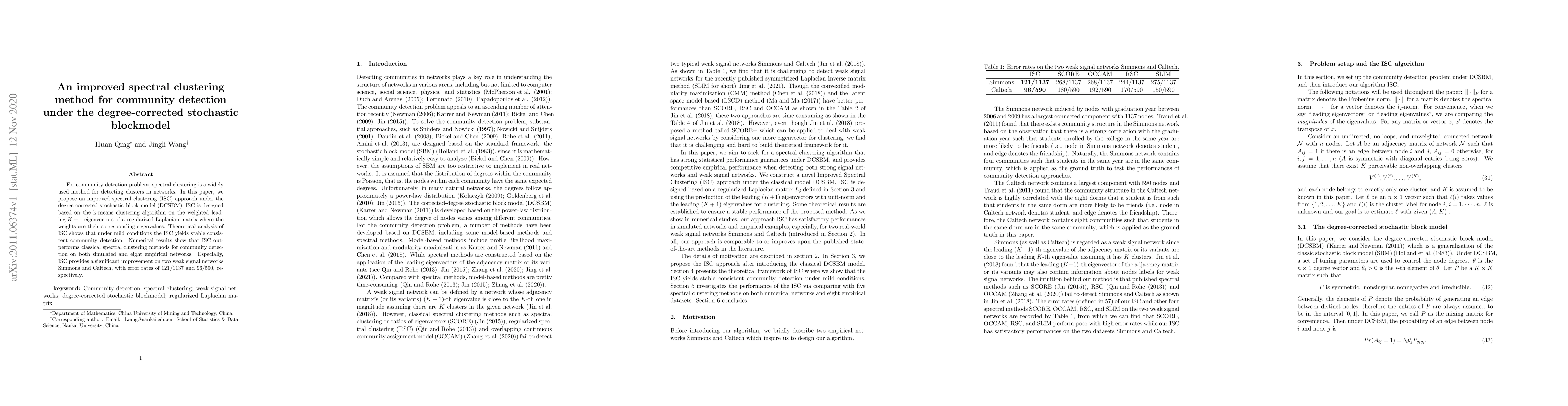 This paper proposes an improved spectral clustering (ISC) method for community detection under the degree-corrected stochastic blockmodel (DCSBM). ISC leverages k-means clustering on weighted eigenvectors of a regularized Laplacian matrix, showing stable and consistent performance theoretically and outperforming classical methods on both simulated and empirical networks.