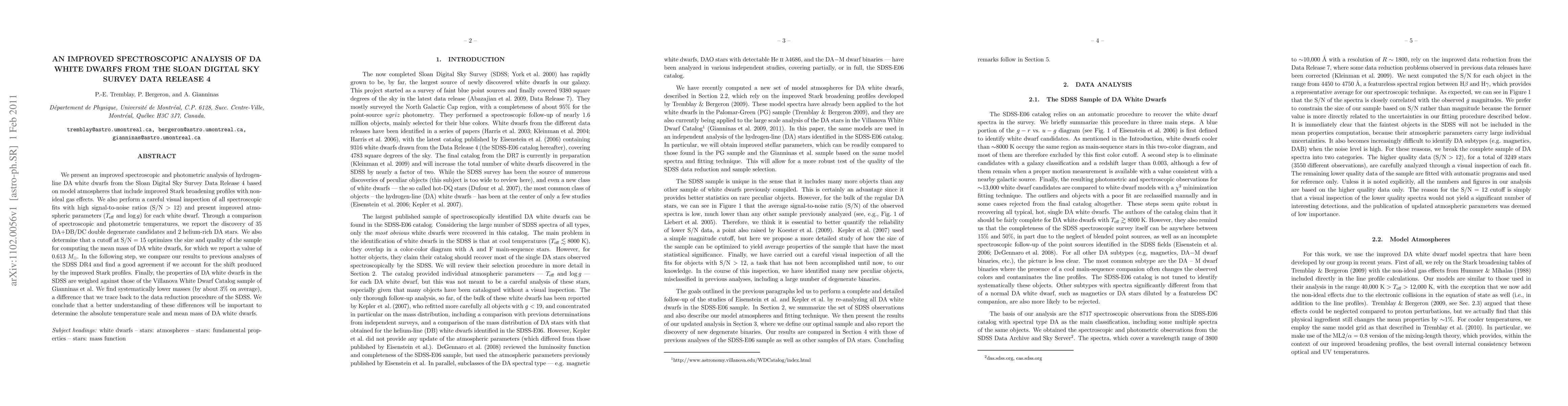 This paper presents an enhanced spectroscopic analysis of DA white dwarfs from SDSS DR4, utilizing improved model atmospheres and high signal-to-noise spectra to refine atmospheric parameters. It identifies 35 DA+DB/DC double degenerate candidates and reports a mean mass of 0.613 Msun for DA white dwarfs, noting systematic mass differences with previous studies due to SDSS data reduction procedures.