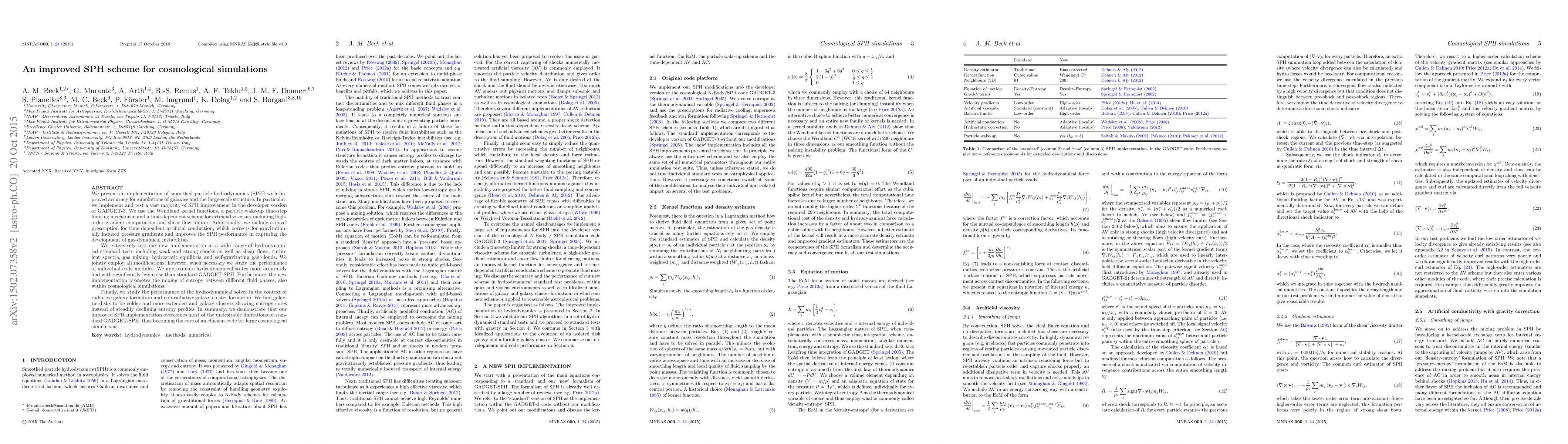 The research presents an improved SPH scheme for cosmological simulations, combining and testing various enhancement techniques in the GADGET code, including Wendland kernel functions, a particle wake-up time-step limiting mechanism, a time-dependent artificial viscosity scheme, and a novel time-dependent artificial conduction prescription.