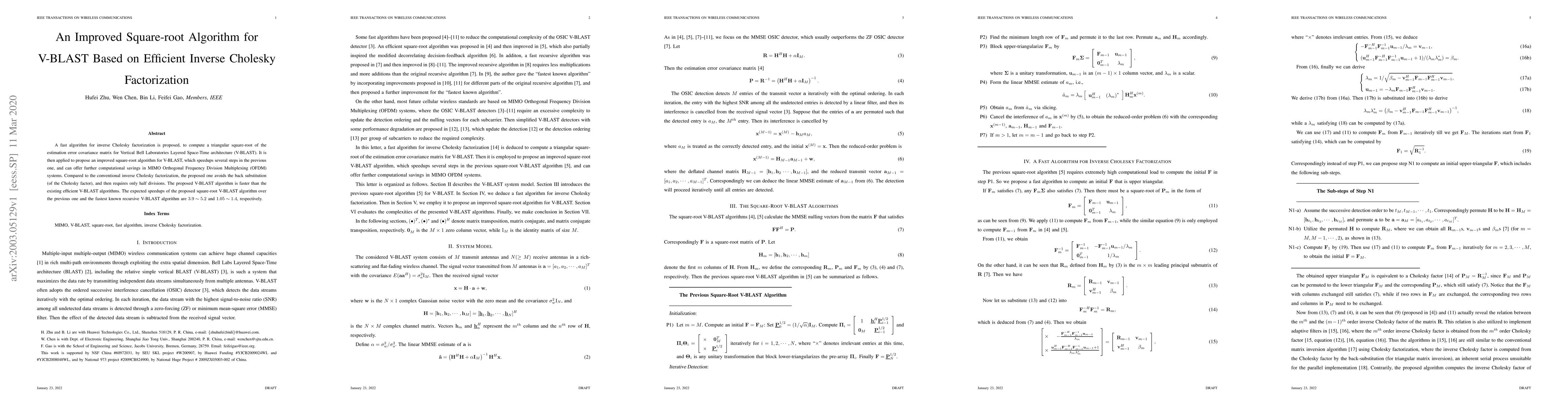 A fast algorithm for inverse Cholesky factorization is proposed, to compute a triangular square-root of the estimation error covariance matrix for Vertical Bell Laboratories Layered Space-Time architecture (V-BLAST). It is then applied to propose an improved square-root algorithm for V-BLAST, which speedups several steps in the previous one, and can offer further computational savings in MIMO Orthogonal Frequency Division Multiplexing (OFDM) systems. Compared to the conventional inverse Cholesky factorization, the proposed one avoids the back substitution (of the Cholesky factor), and then requires only half divisions. The proposed V-BLAST algorithm is faster than the existing efficient V-BLAST algorithms. The expected speedups of the proposed square-root V-BLAST algorithm over the previous one and the fastest known recursive V-BLAST algorithm are 3.9~5.2 and 1.05~1.4, respectively.