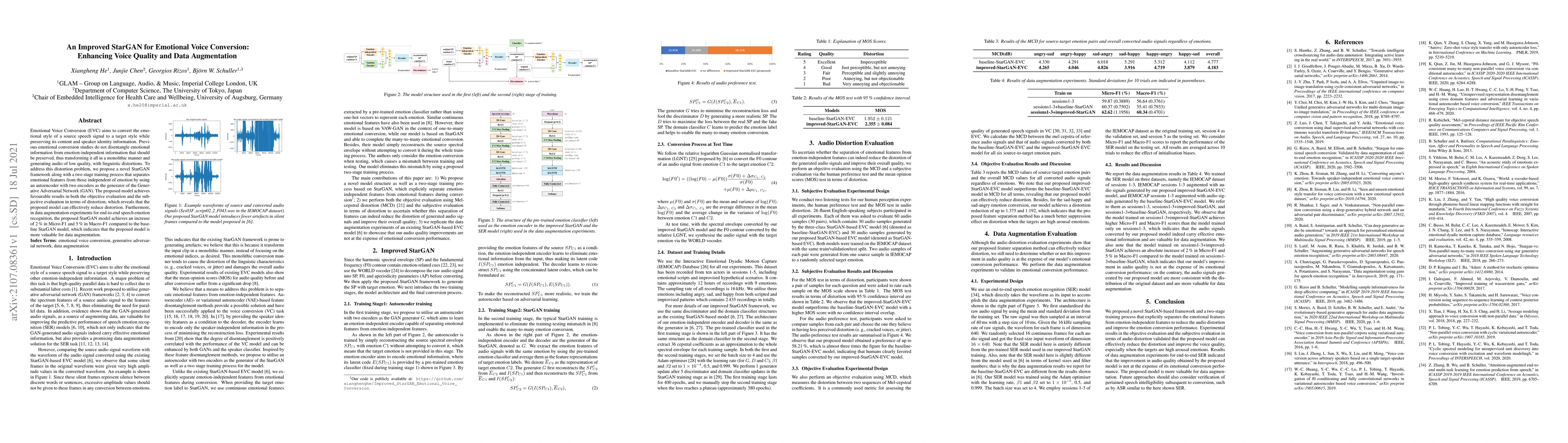 The paper proposes an improved StarGAN framework for Emotional Voice Conversion that separates emotional features from emotion-independent features, achieving better voice quality and reducing distortions. The model also enhances data augmentation for speech emotion recognition, improving Micro-F1 and Macro-F1 scores.