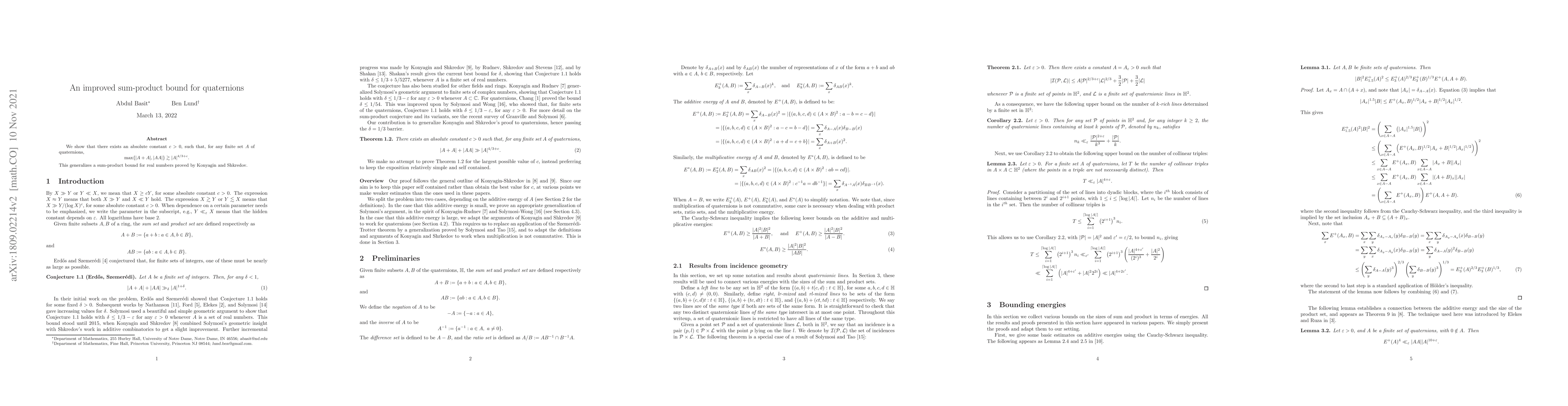 We show that there exists an absolute constant $c > 0$, such that, for any finite set $A$ of quaternions, \[ \max\{|A+A, |AA| \} \gtrsim |A|^{4/3 + c}. \] This generalizes a sum-product bound for real numbers proved by Konyagin and Shkredov.