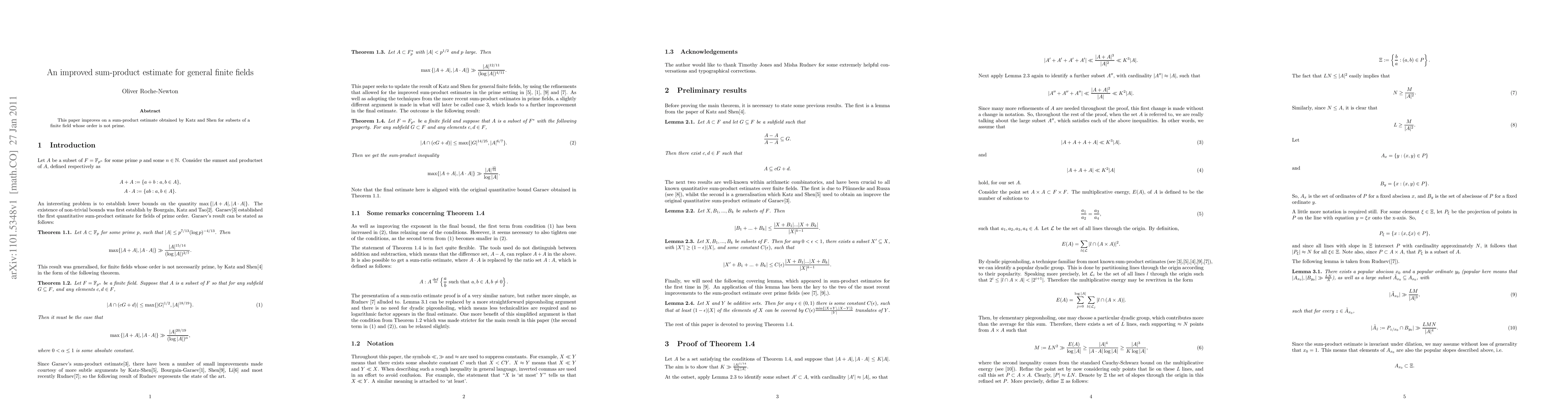 Summary: This paper refines the sum-product estimate for subsets of non-prime order finite fields, enhancing the original result established by Katz and Shen. The new method provides better bounds for the interaction between sums and products within these sets.