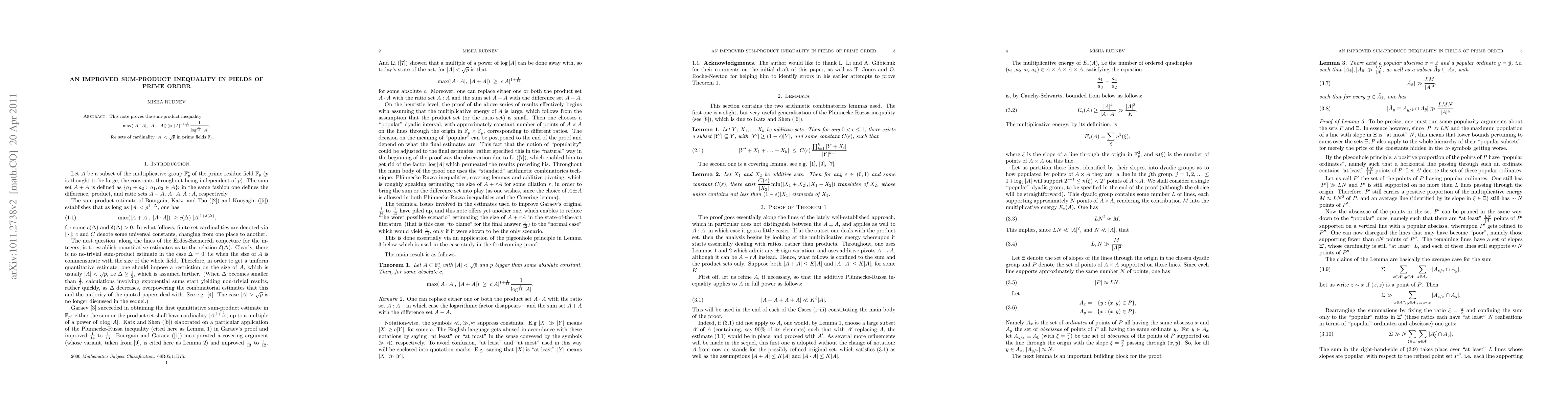 Researchers improved the best known exponent in a prime field sum-product inequality to 1/11, with a small logarithmic factor increase.