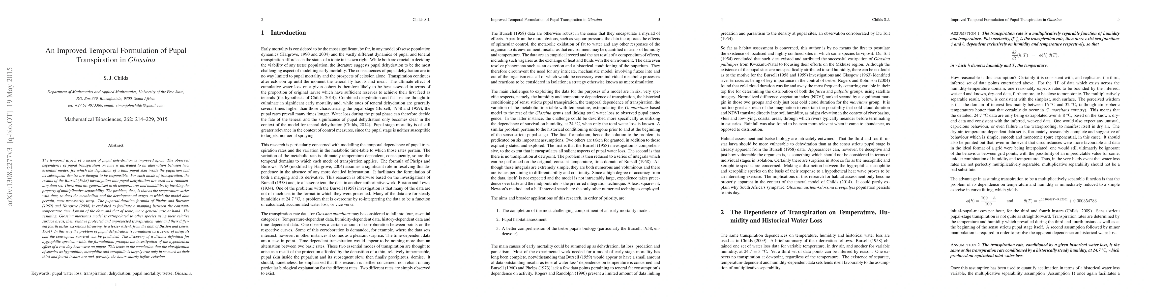 The temporal aspect of a model of pupal dehydration is improved upon. The observed dependence of pupal transpiration on time is attributed to an alternation between two, essential modes, for which the deposition of a thin, pupal skin inside the puparium and its subsequent demise are thought to be responsible. For each mode of transpiration, the results of the Bursell (1958) investigation into pupal dehydration are used as a rudimentary data set. These data are generalised to all temperatures and humidities by invoking the property of multiplicative separability. The problem, then, is that as the temperature varies with time, so does the metabolism and the developmental stages to which the model data pertain, must necessarily warp. The puparial-duration formula of Phelps and Burrows (1969) and Hargrove (2004) is exploited to facilitate a mapping between the constant-temperature time domain of the data and that of some, more general case at hand. The resulting, Glossina morsitans model is extrapolated to other species using their relative surface areas, their relative protected and unprotected transpiration rates and their different fourth instar excretions (drawing, to a lesser extent, from the data of Buxton and Lewis, 1934). In this way the problem of pupal dehydration is formulated as a series of integrals and the consequent survival can be predicted. The discovery of a distinct definition for hygrophilic species, within the formulation, prompts the investigation of the hypothetical effect of a two-day heat wave on pupae. This leads to the conclusion that the classification of species as hygrophilic, mesophilic and xerophilic is largely true only in so much as their third and fourth instars are and, possibly, the hours shortly before eclosion.