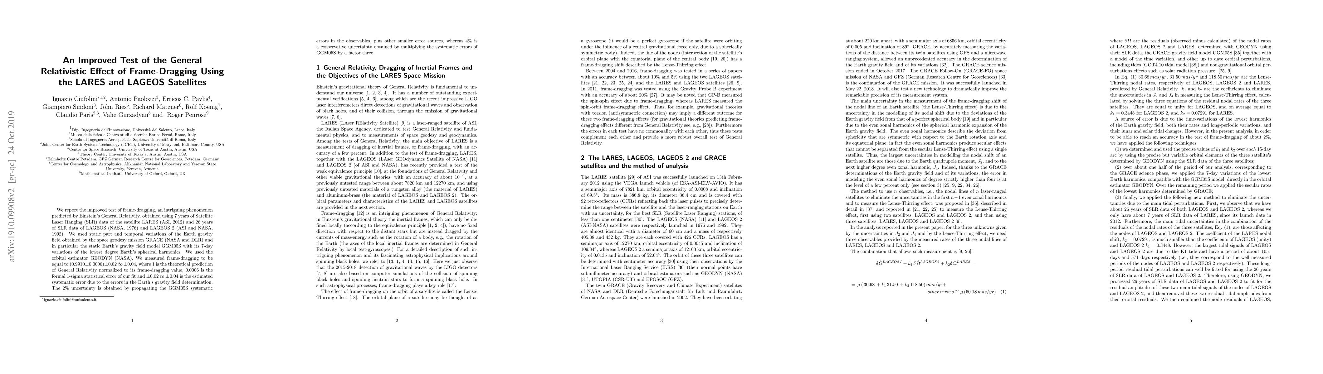 This paper reports an improved test of frame-dragging, a General Relativity prediction, using 7 years of LARES and 26 years of LAGEOS satellite data. The measurement confirms the General Relativity prediction with a 0.9910 +/- 0.02 value, indicating a few percent uncertainty due to modeling errors.