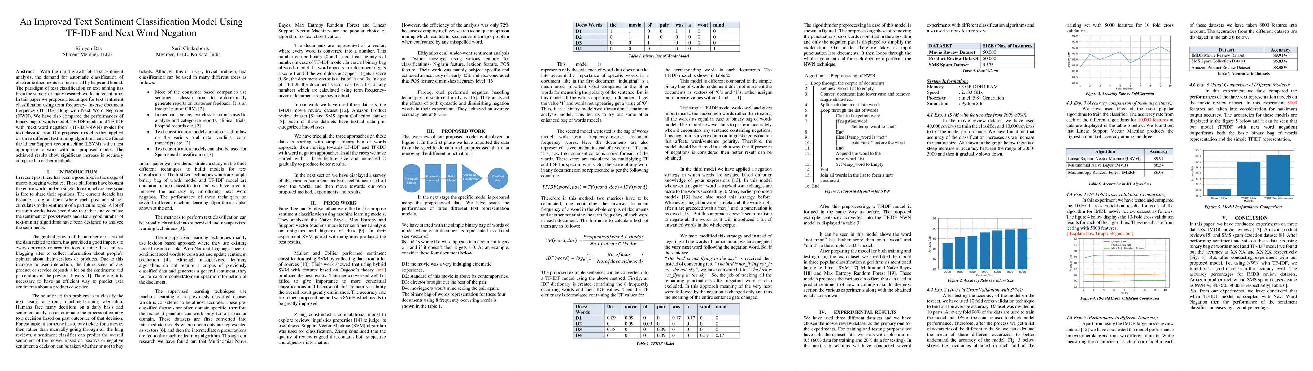 This paper proposes a text sentiment classification model that combines TF-IDF with Next Word Negation (NWN) to improve accuracy. Experiments comparing various models show that TF-IDF-NWN with Linear Support Vector Machine (LSVM) achieves significant accuracy improvements over previous methods.