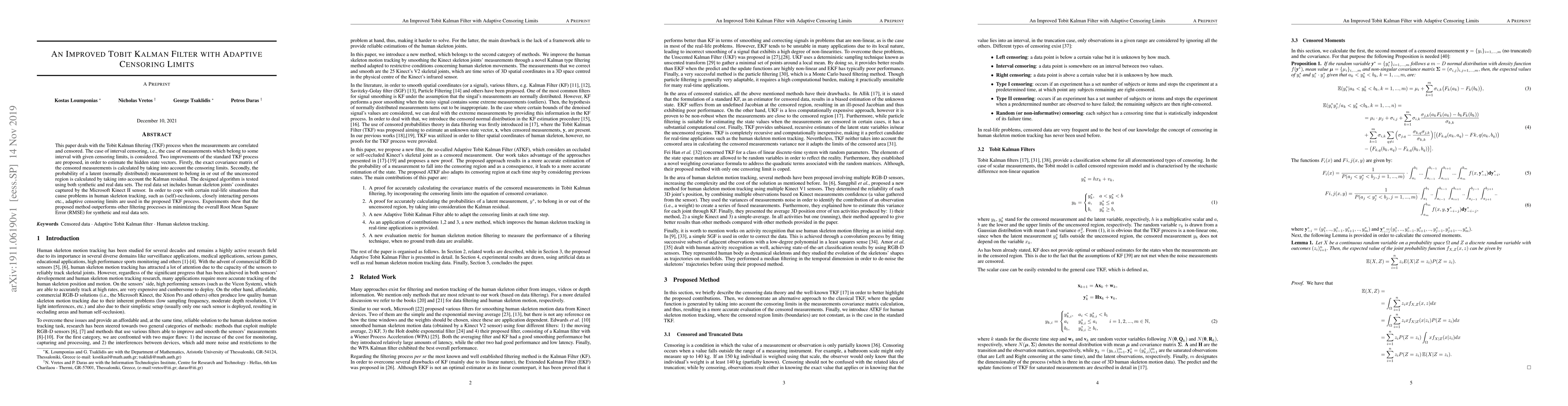 This paper deals with the Tobit Kalman filtering (TKF) process when the measurements are correlated and censored. The case of interval censoring, i.e., the case of measurements which belong to some interval with given censoring limits, is considered. Two improvements of the standard TKF process are proposed, in order to estimate the hidden state vectors. Firstly, the exact covariance matrix of the censored measurements is calculated by taking into account the censoring limits. Secondly, the probability of a latent (normally distributed) measurement to belong in or out of the uncensored region is calculated by taking into account the Kalman residual. The designed algorithm is tested using both synthetic and real data sets. The real data set includes human skeleton joints' coordinates captured by the Microsoft Kinect II sensor. In order to cope with certain real-life situations that cause problems in human skeleton tracking, such as (self)-occlusions, closely interacting persons etc., adaptive censoring limits are used in the proposed TKF process. Experiments show that the proposed method outperforms other filtering processes in minimizing the overall Root Mean Square Error (RMSE) for synthetic and real data sets.