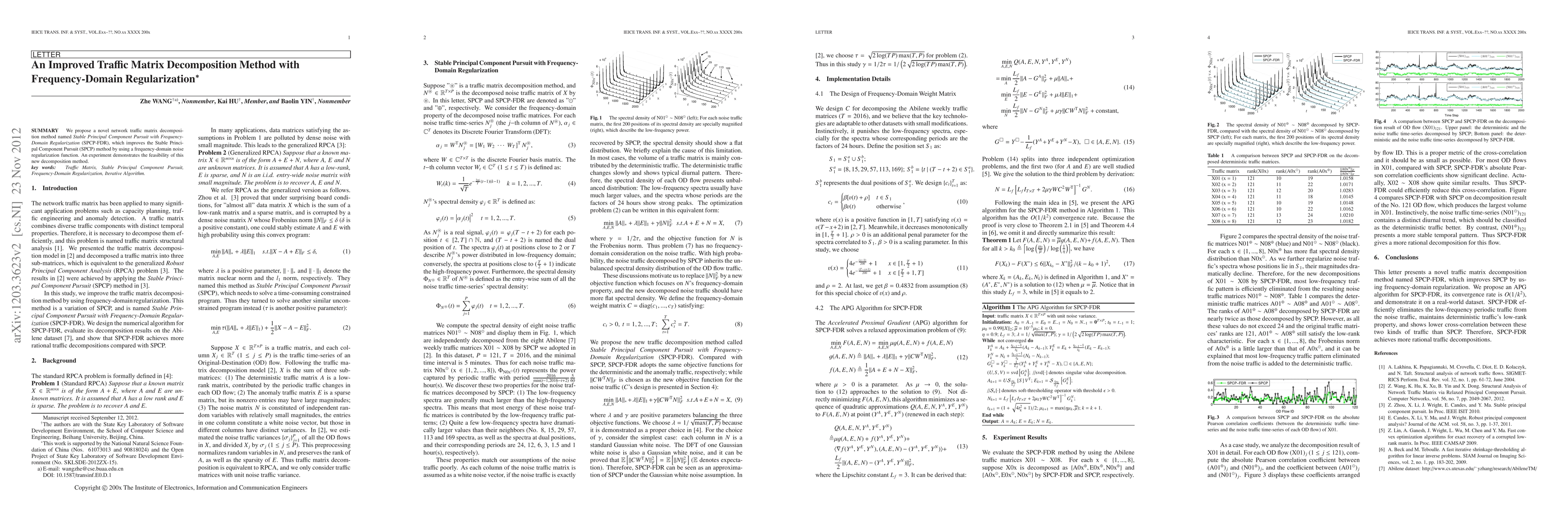 We propose a novel network traffic matrix decomposition method named Stable Principal Component Pursuit with Frequency-Domain Regularization (SPCP-FDR), which improves the Stable Principal Component Pursuit (SPCP) method by using a frequency-domain noise regularization function. An experiment demonstrates the feasibility of this new decomposition method.