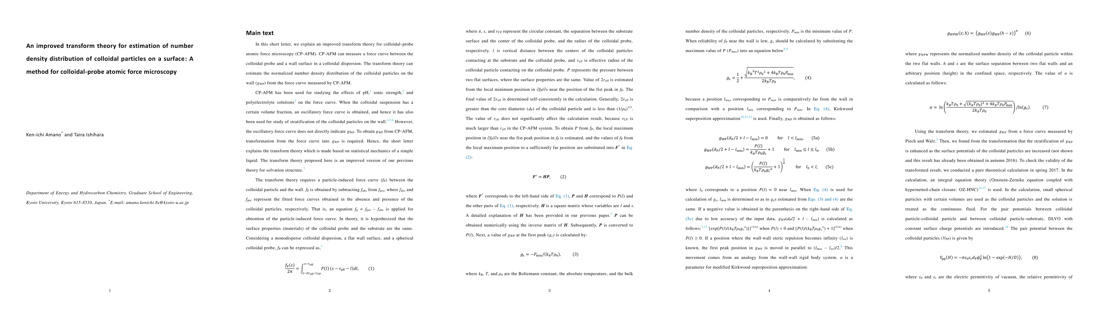 This paper presents an improved transform theory for colloidal-probe atomic force microscopy (CP-AFM) to estimate the normalized number density distribution of colloidal particles on a surface. The method enhances the understanding of colloidal particle stratification, crucial for studying colloidal crystal and glass formation.