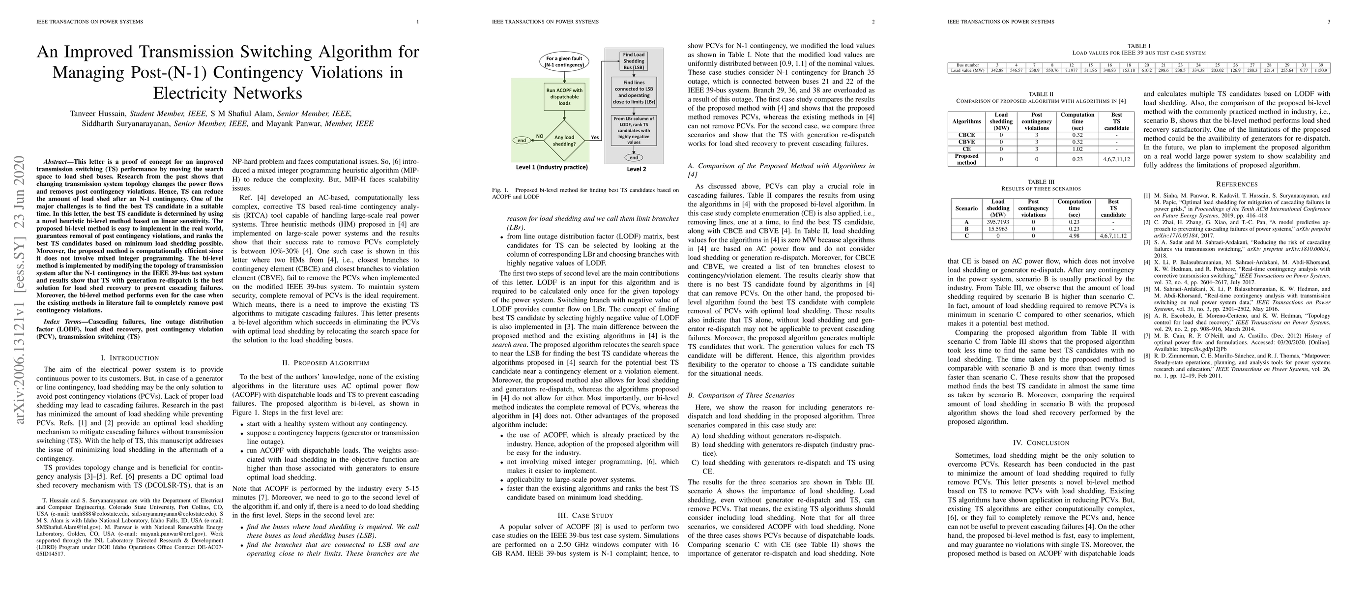 This paper proposes a novel heuristic bi-level method for identifying optimal transmission switching candidates to manage post-(N-1) contingency violations, minimizing load shedding and ensuring efficient power flow recovery. The method, based on linear sensitivity, outperforms existing techniques and is computationally efficient without requiring mixed integer programming.