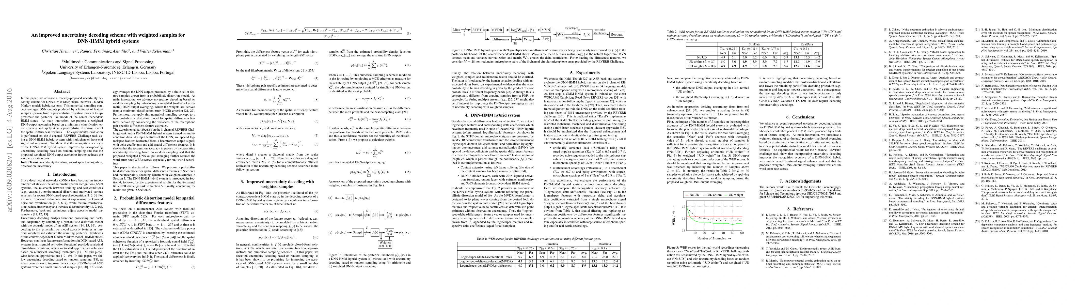 This paper improves an uncertainty decoding scheme for DNN-HMM hybrid systems using weighted averaging of neural network outputs based on a minimum classification error criterion, leading to improved recognition accuracy and reduced word error rates.