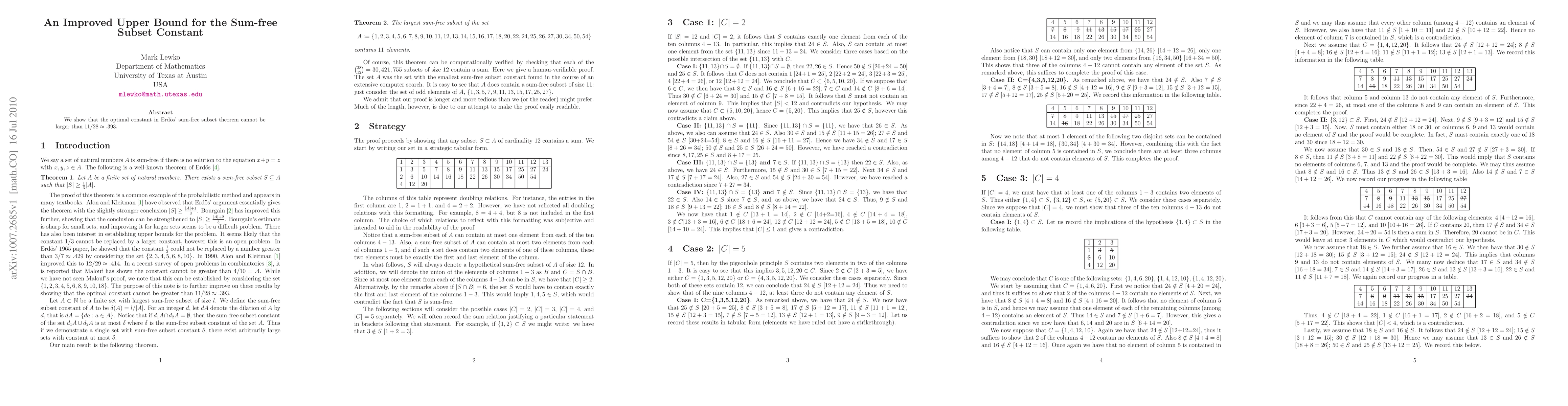 We show that the optimal constant in Erd\"{o}s' sum-free subset theorem cannot be larger than $11/28 \approx .393$.