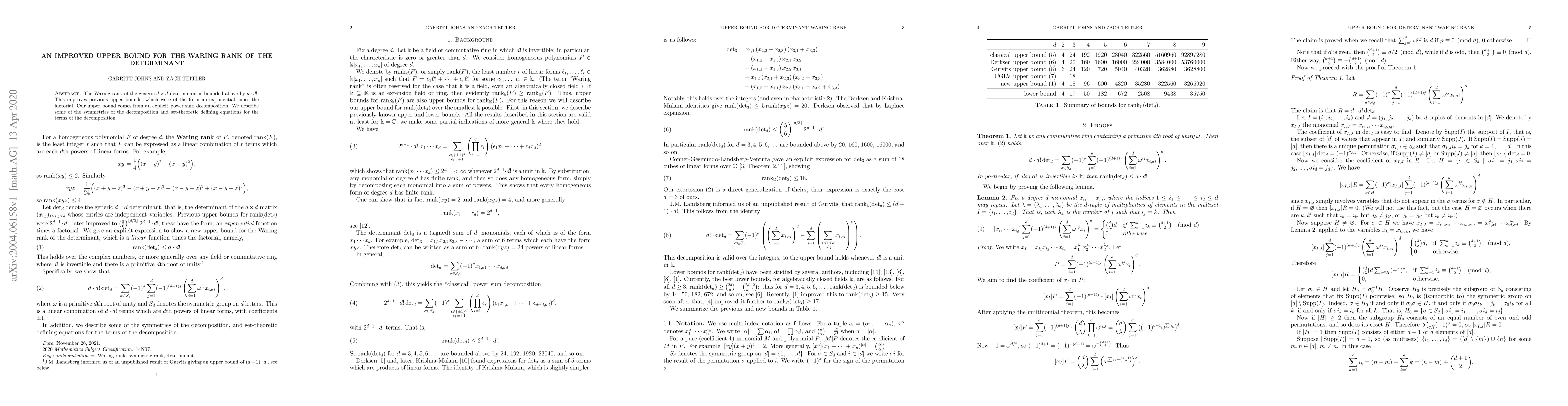 The Waring rank of the generic $d \times d$ determinant is bounded above by $d \cdot d!$. This improves previous upper bounds, which were of the form an exponential times the factorial. Our upper bound comes from an explicit power sum decomposition. We describe some of the symmetries of the decomposition and set-theoretic defining equations for the terms of the decomposition.