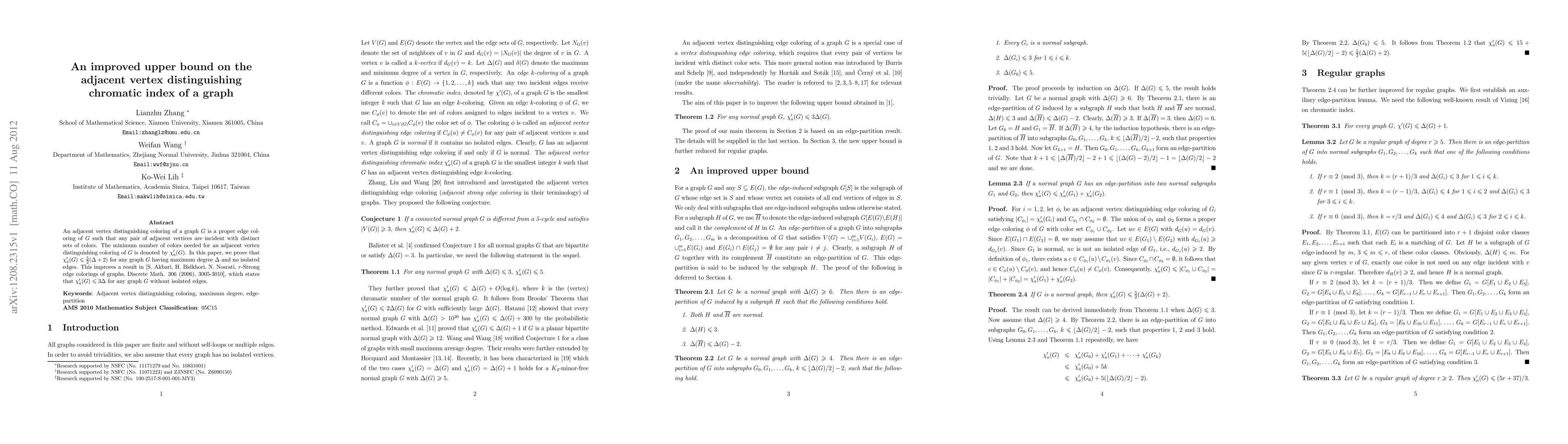 This paper establishes a new upper bound for the adjacent vertex distinguishing chromatic index of a graph, denoted as $\chi'_a(G)$, proving that $\chi_a'(G)$ <= 5($\Delta+2$)/2 for any graph G with maximum degree $\Delta$ and no isolated edges, thus improving upon a previous result.