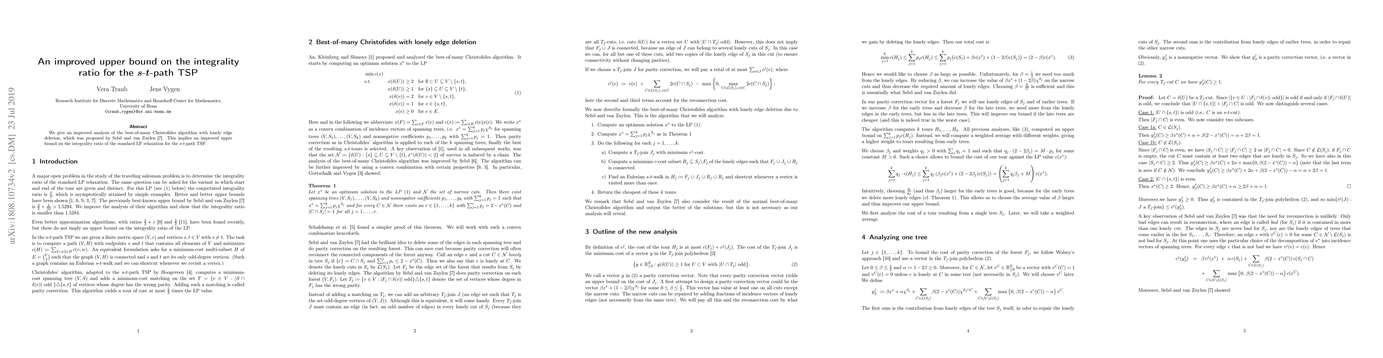 We give an improved analysis of the best-of-many Christofides algorithm with lonely edge deletion, which was proposed by Seb\H{o} and van Zuylen [2016]. This implies an improved upper bound on the integrality ratio of the standard LP relaxation for the $s$-$t$-path TSP.